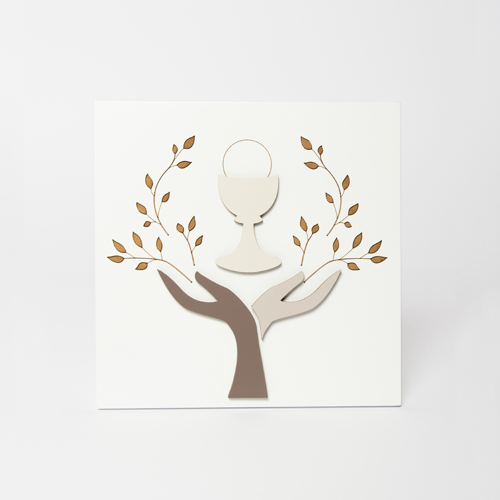 Foto e shenjtë me dekorime të aplikuara në dru të lyer me kakao, zhavorr dhe rërë dhe shënjim me lazer të degëve dhe gjetheve. Ai përfaqëson dy duar që mirëpresin kupën e kungimit. Piktura është në dru të bardhë me llak me një vrimë për ta varur në mur dhe një këmbë për mbështetje.