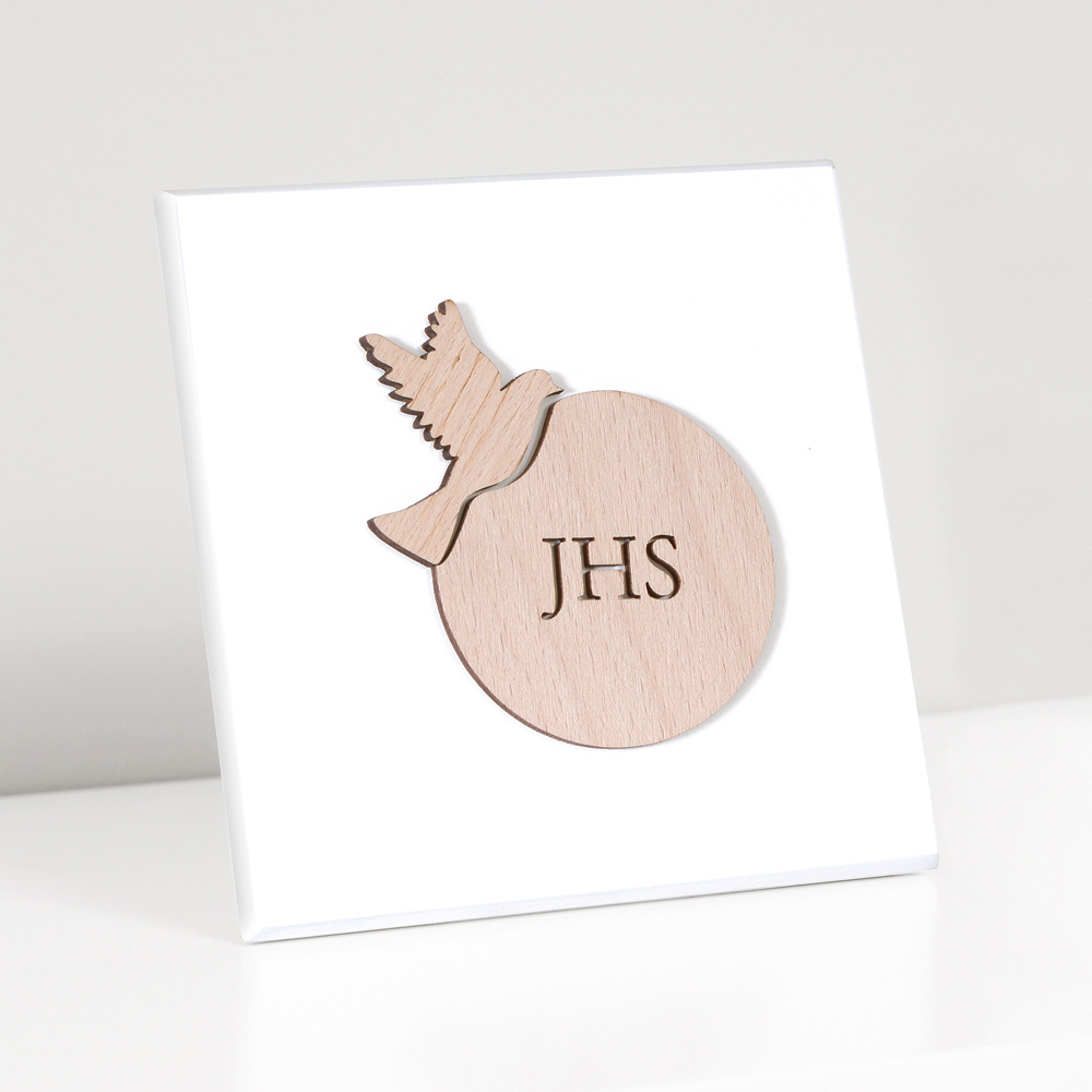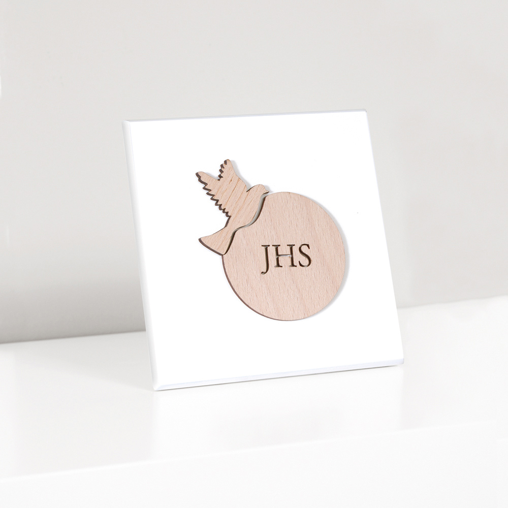 Foto e shenjtë me pritës dhe pëllumb konfirmimi në dru natyral të aplikuar. Panel druri i bardhë me llak me këmbë mbështetëse dhe vrimë për ta varur në mur.