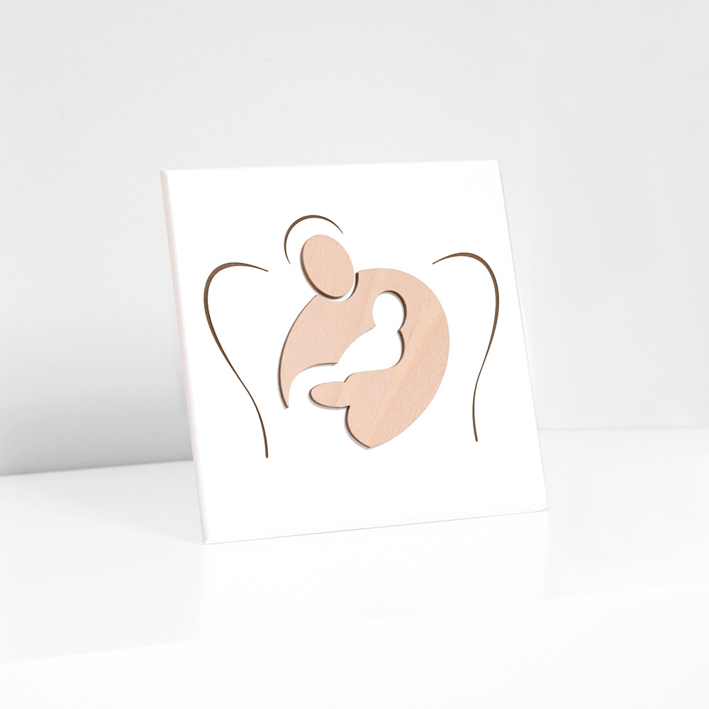 Foto e shenjtë me aplikim me dru natyral të një nëne që përqafon një fëmijë dhe gdhendje me lazer. Panel druri i bardhë me llak me këmbë mbështetëse dhe vrimë për ta varur në mur.