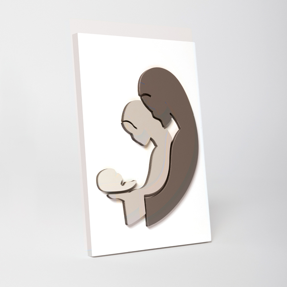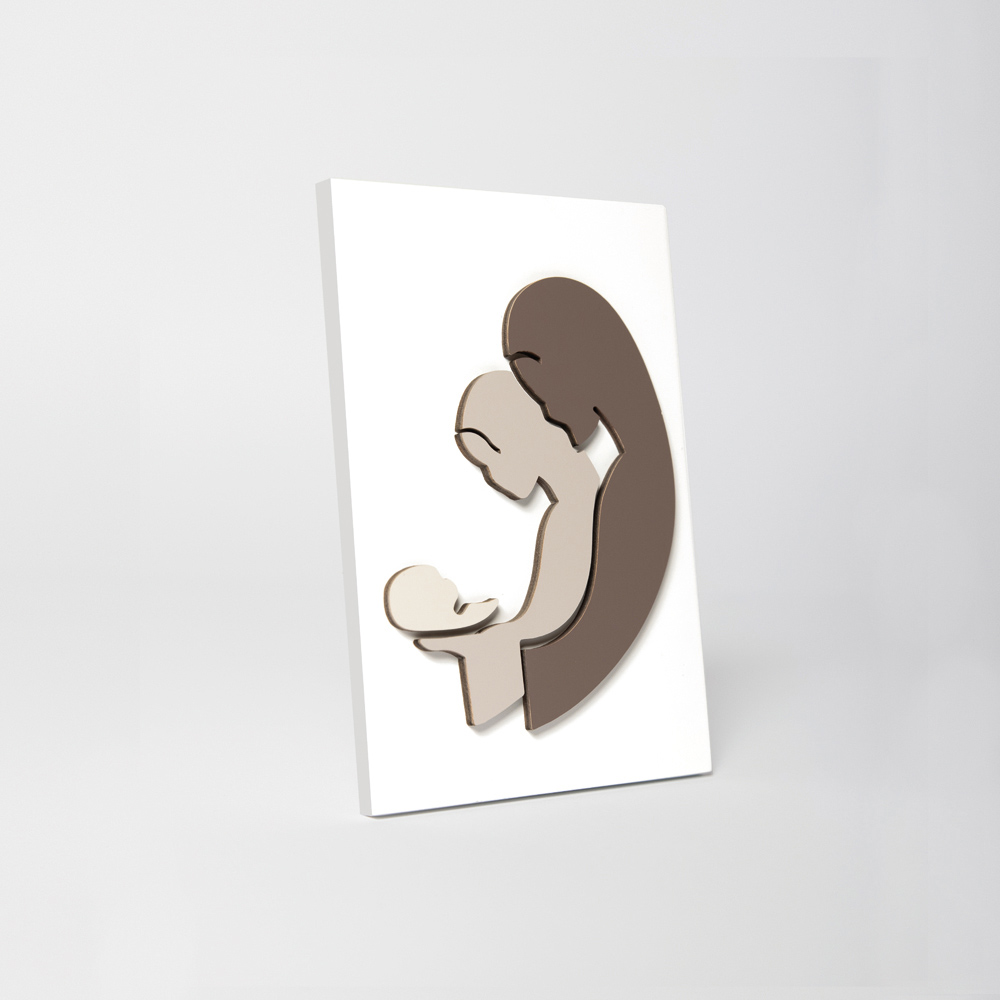Foto e shenjtë me familjen e shenjtë e aplikuar në tre ngjyra: kakao, zhavorr dhe rërë . Panel druri i bardhë me llak me këmbë mbështetëse.