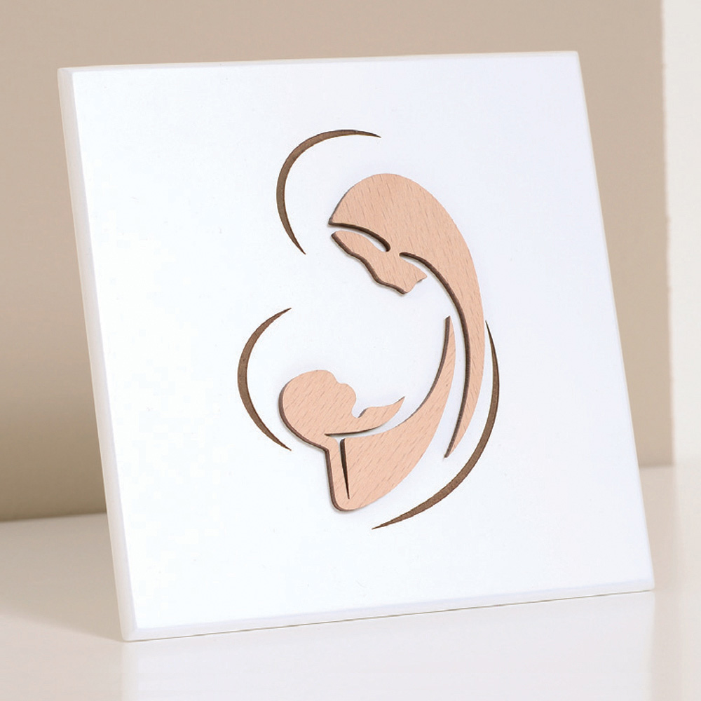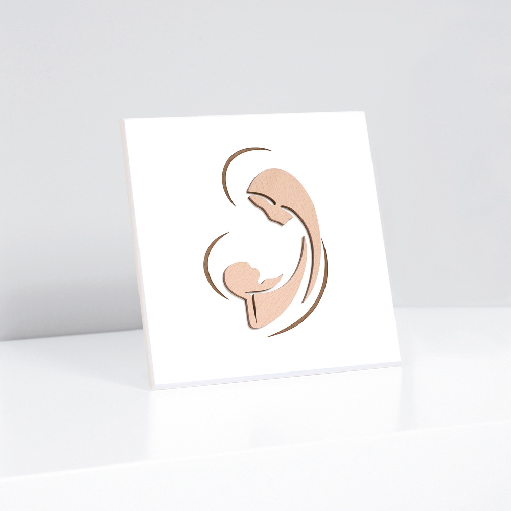 Foto e shenjtë me nënë dhe fëmijë të stilizuar, e aplikuar në dru natyral. Panel druri i bardhë me llak me këmbë mbështetëse dhe vrimë për ta varur në mur.