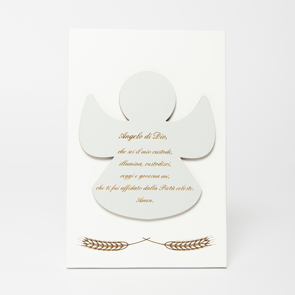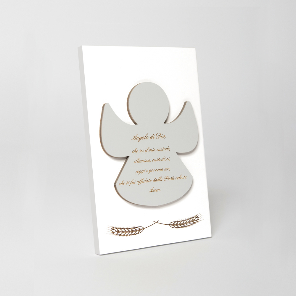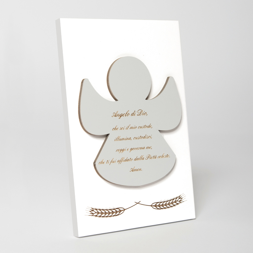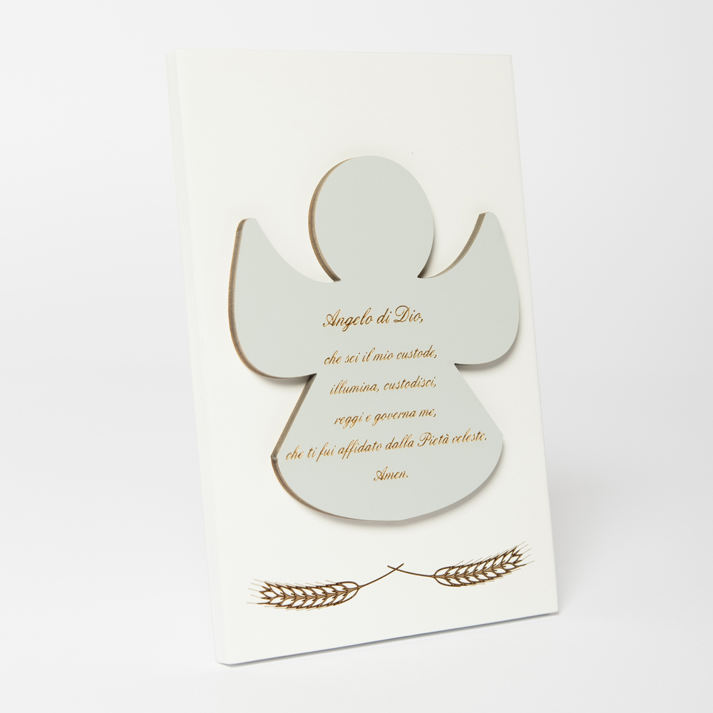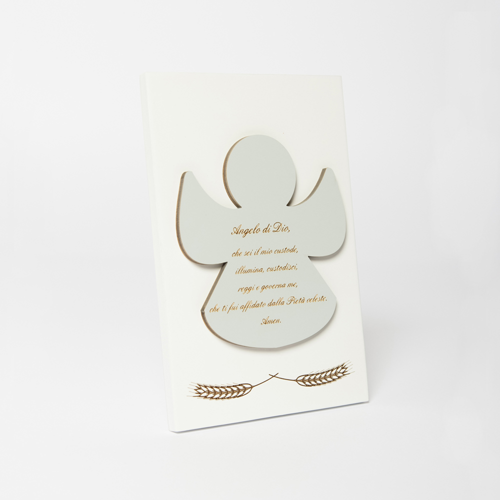 Foto e shenjtë me aplikimin e një engjëlli me lutje të gdhendur. Panel druri i bardhë me llak me këmbë mbështetëse. Aplikimi në gri pluhur.