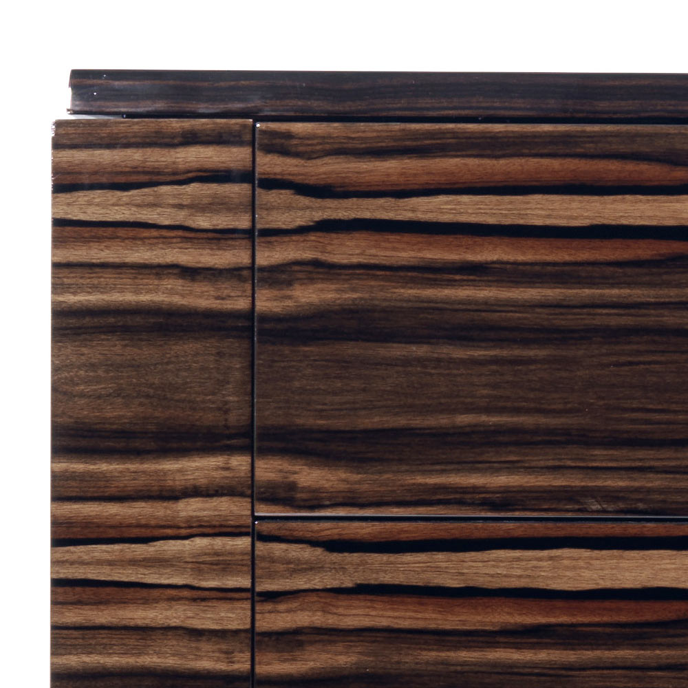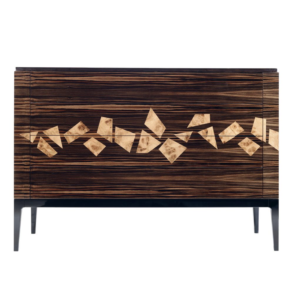 Dizenjoni një bufe prej druri me zeza me 4 sirtarë të bërë në Itali Grilli Zarafa Kater dollapë për modelimin e sirtarëve me një strukturë druri me ngjyrim shumëfaqësh me rimeso, me fut koriandër në briar arre Ferrarese. Kryeja është në lëvore me rërë të mbuluar me huall mjalti dhe baza në dru tuliperi të ngurtë të lyer me zi. Vizat janë të pajisura me udhëzues rrëshqitës tërheqës dhe duke mbyllur me një sistem të heshtur; rreshtimi në pjesën e sipërme është lëkure.