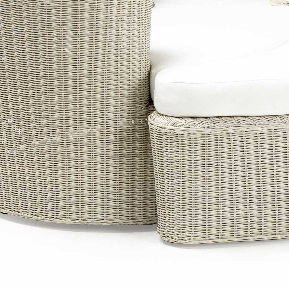 Struktura e këtij shtrati në natyrë është bërë me një kornizë alumini të veshur me pluhur, mbi të cilën fibra e cilësisë së lartë 3 mm e trashë e markës Rehau Polyrattan është endur me dorë . Jastëkët e sediljeve dhe të pasmeve të përfshira në ngjyrën standarde të bardhë.