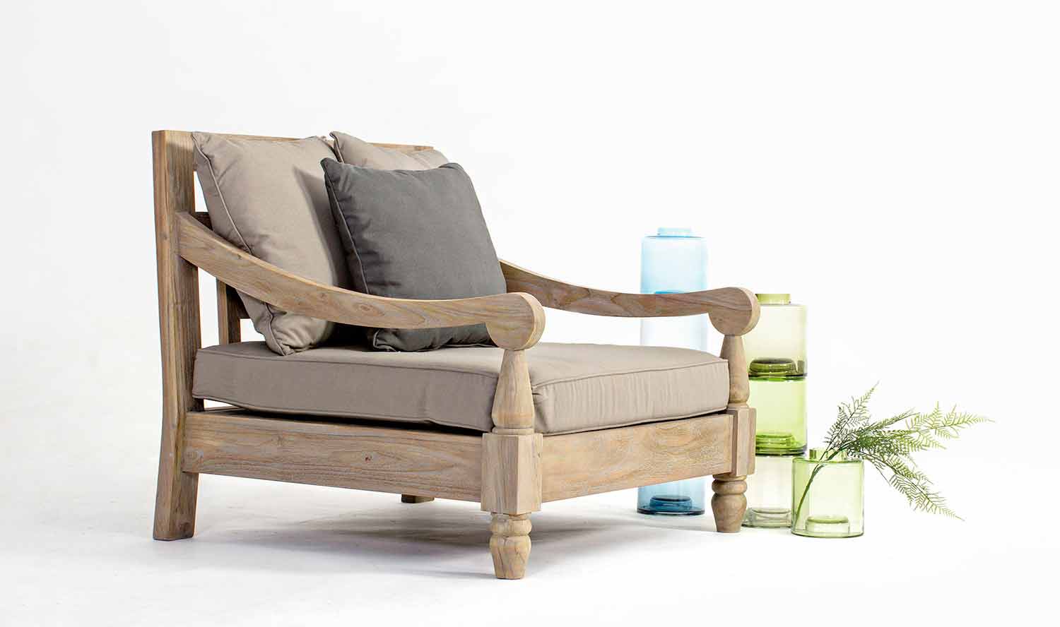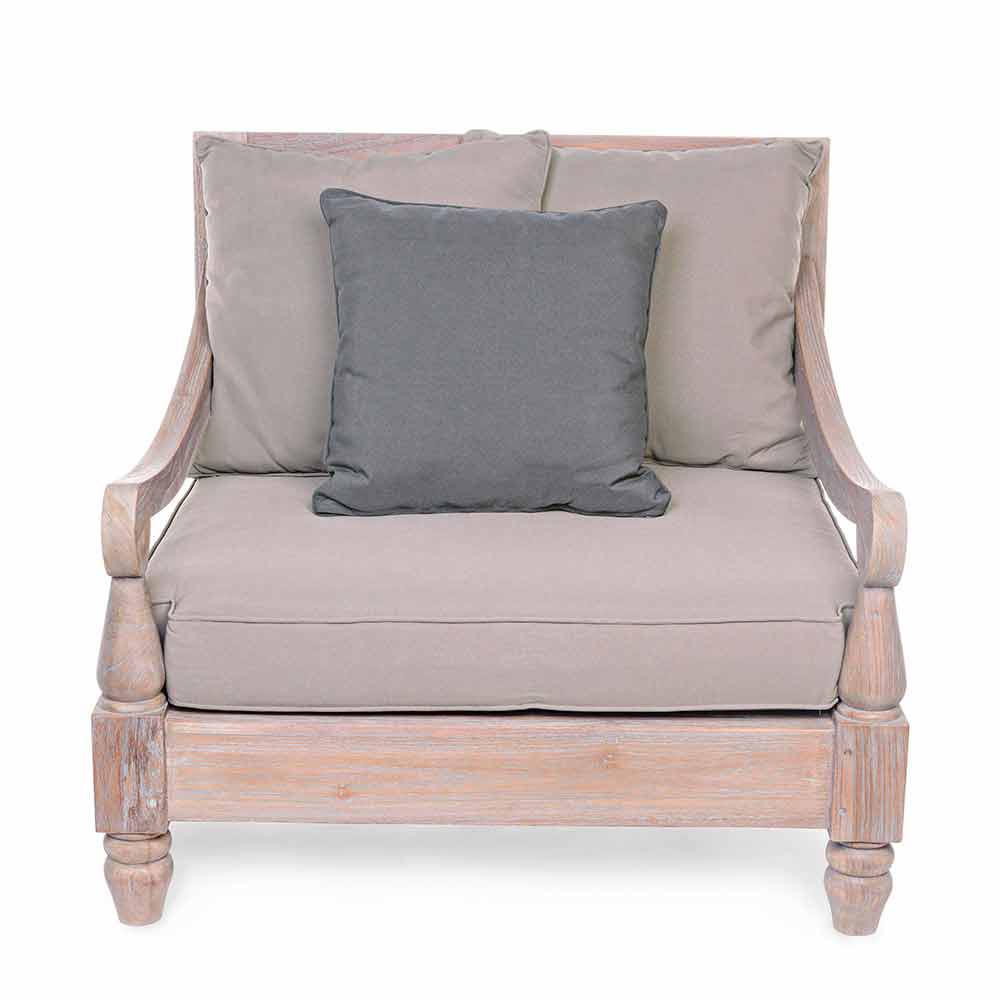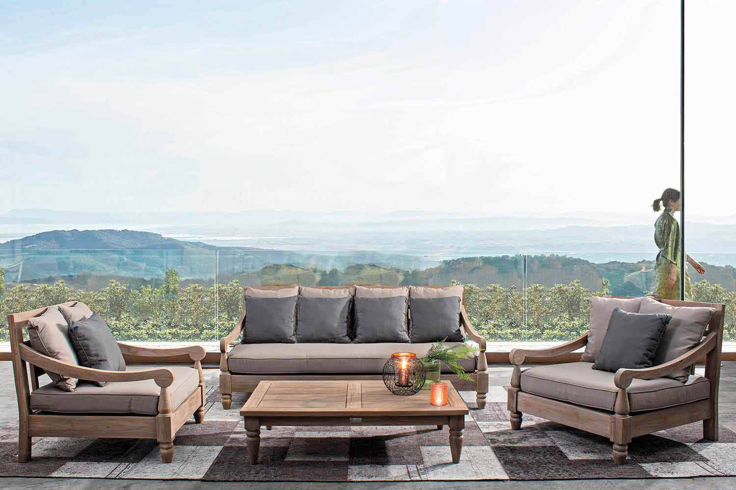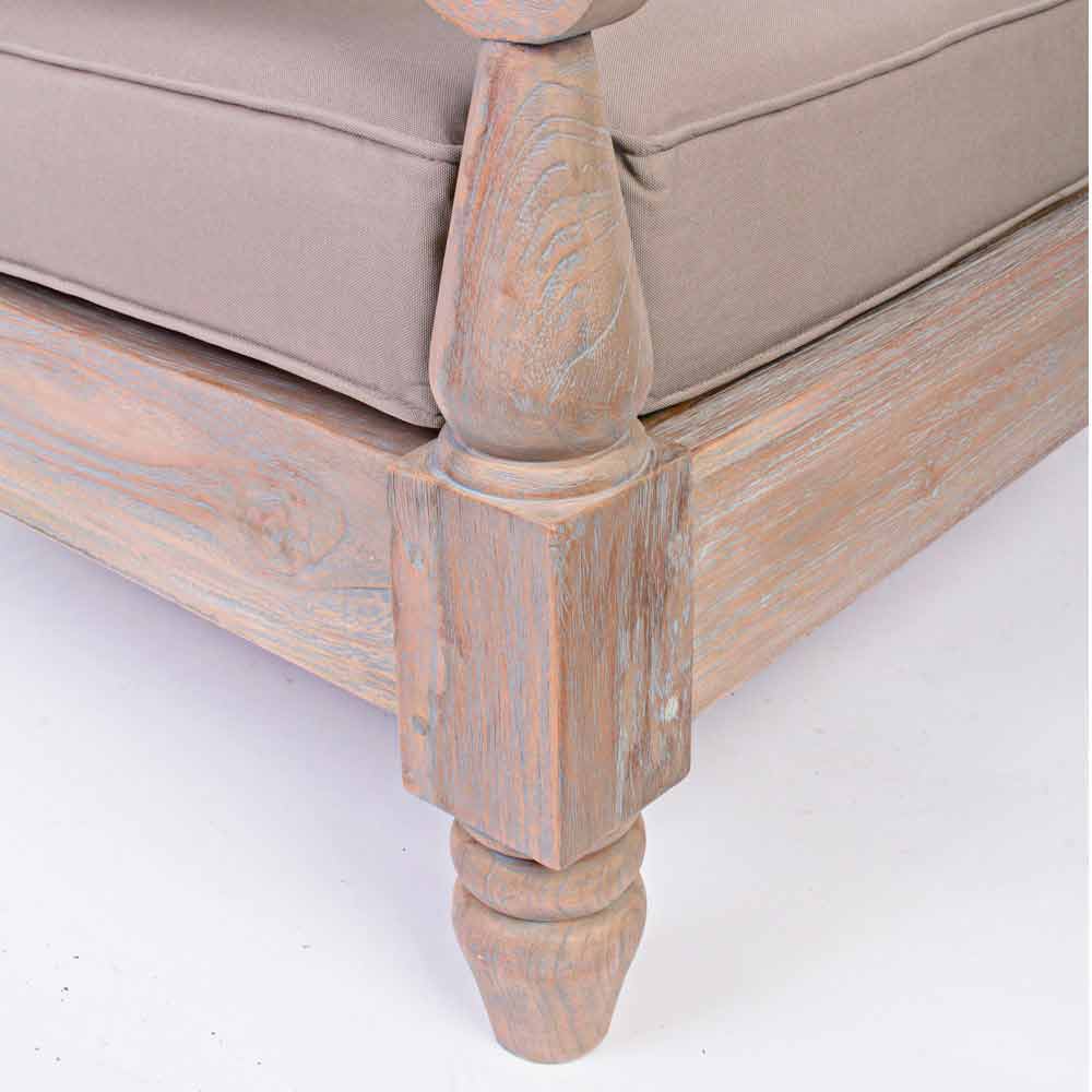 100% dru dru tik druri i FSC, mbarim i rërë dhe plakje me bazë uji. Jastëkë të heqshëm me pëlhurë olefine të papërshkueshëm nga dielli (polipropileni 100%).