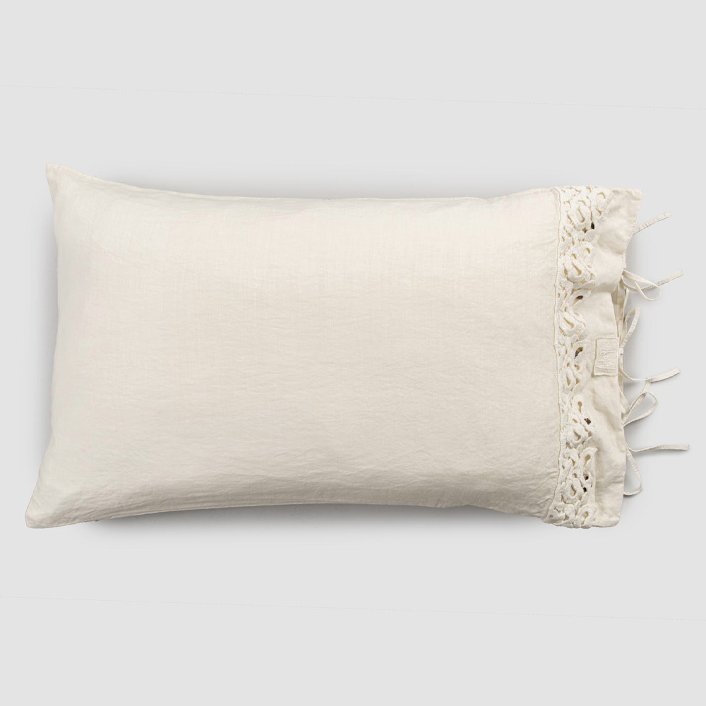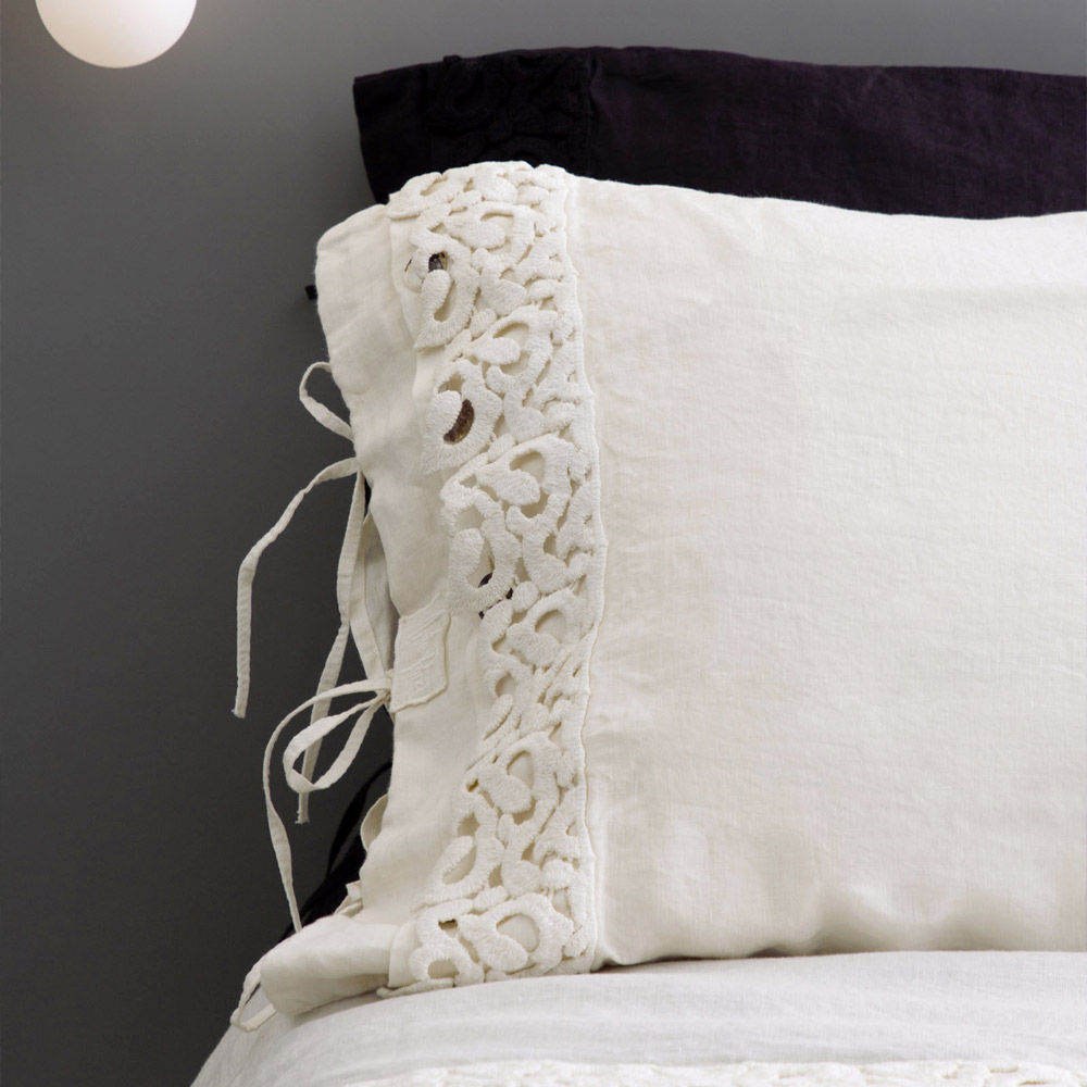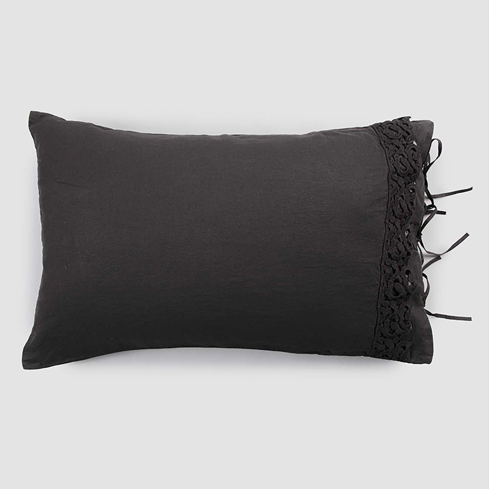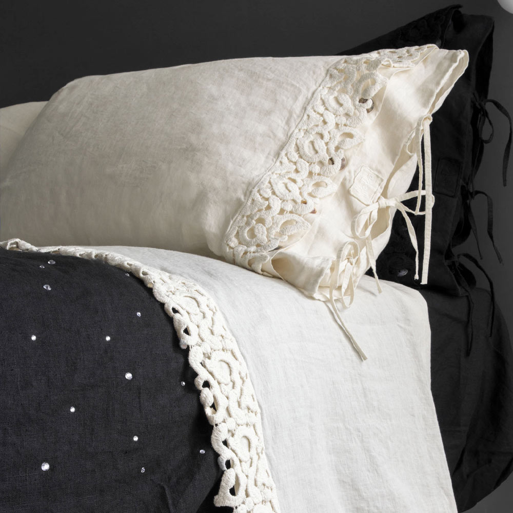 Këllëf jastëku në liri të zi ose gjalpë me dantella poezie, send luksoz i prodhuar në Itali.