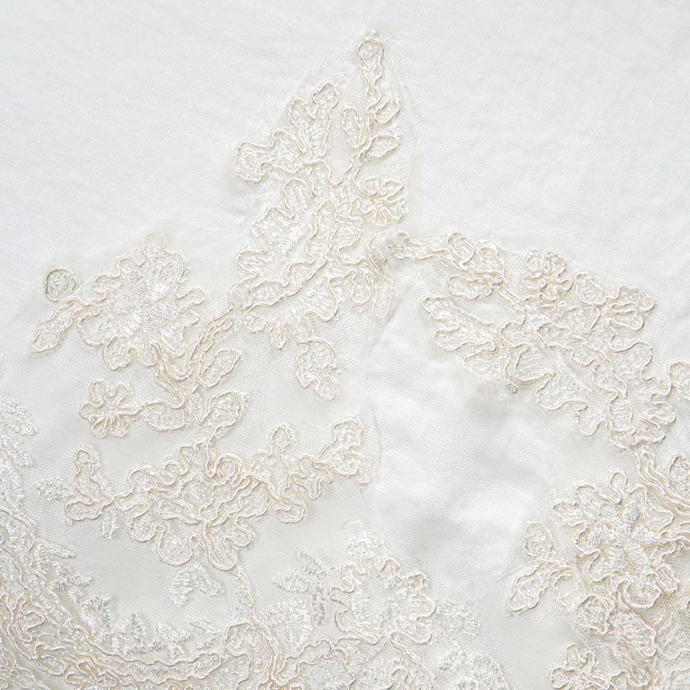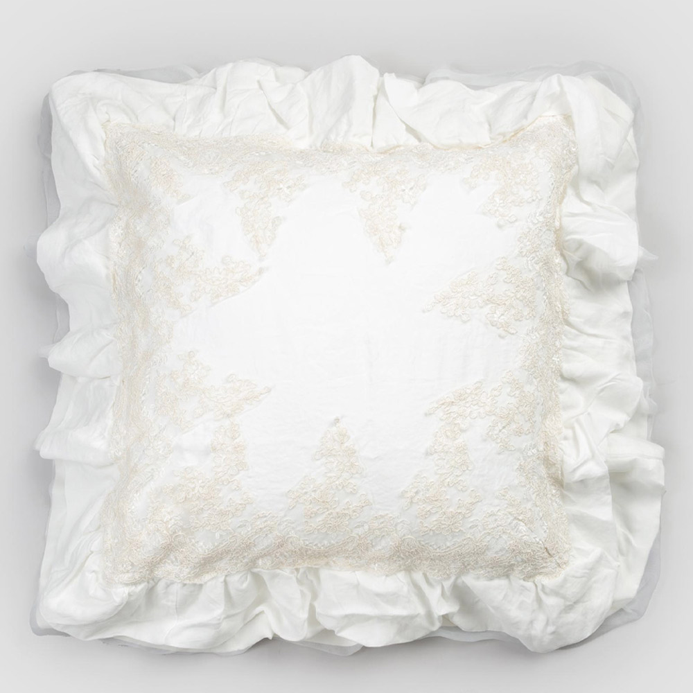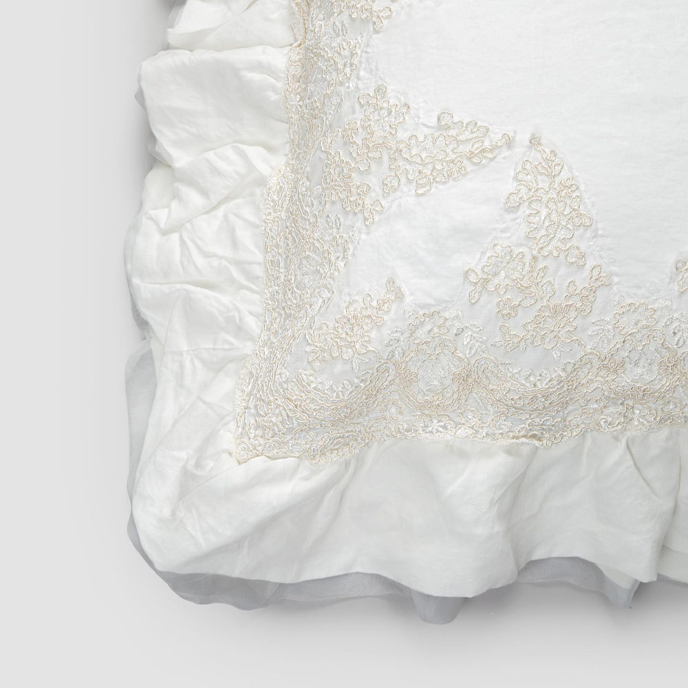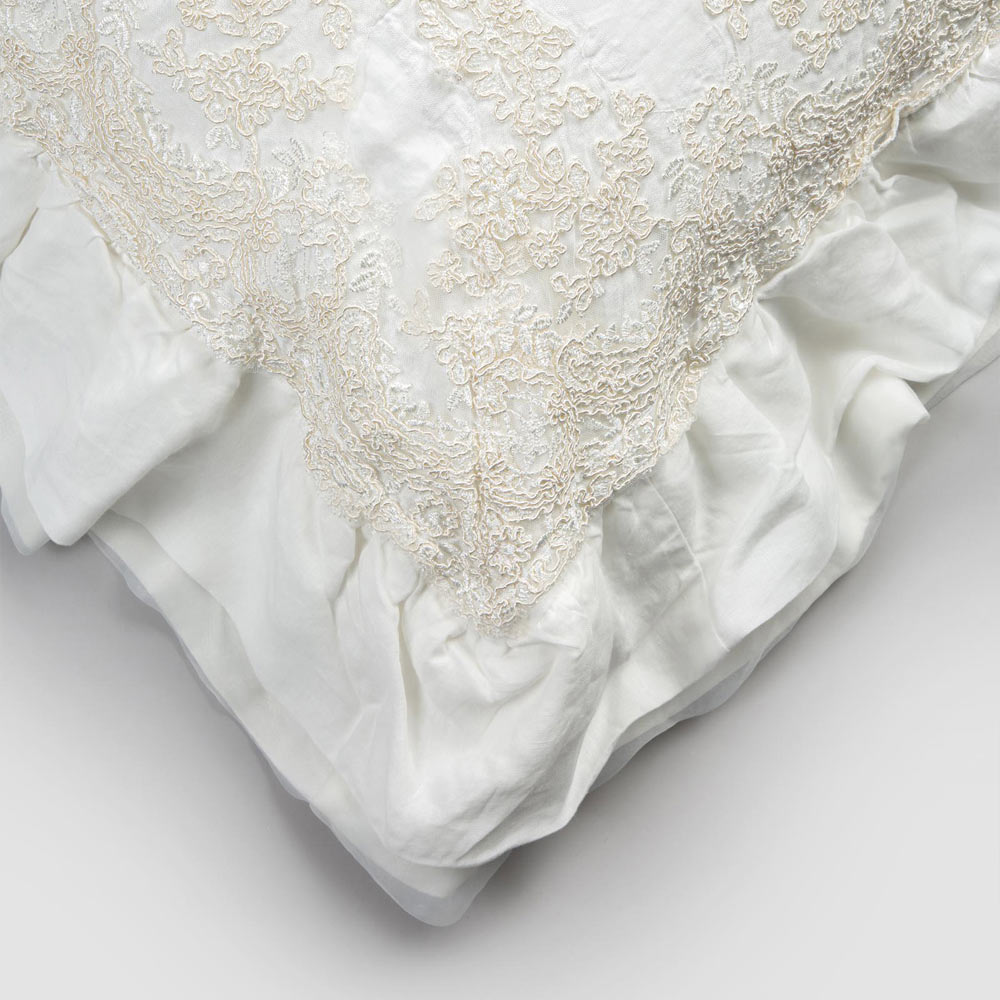 Jastëk dekorativ në liri të bardhë natyral me dantella elegante dhe flounces, prodhuar në cilësi të Italisë