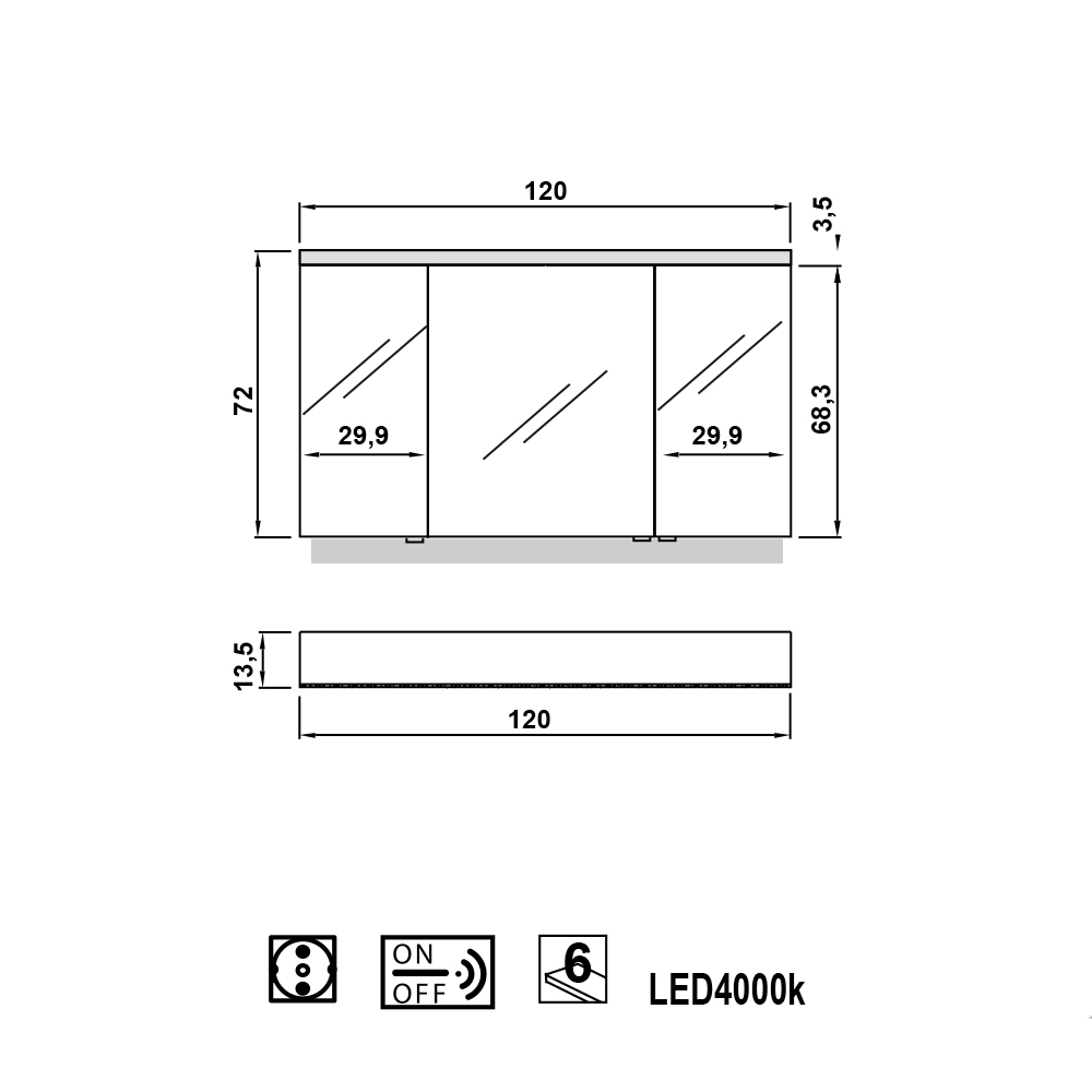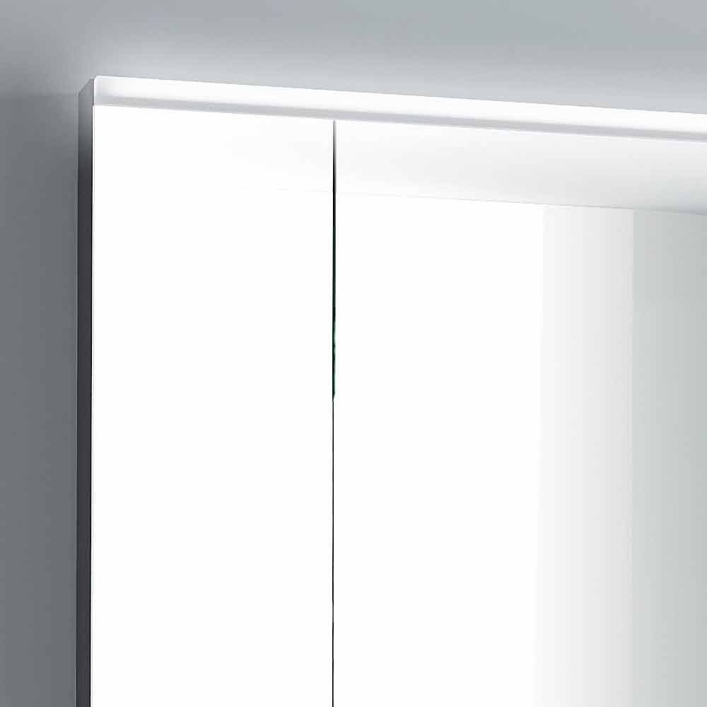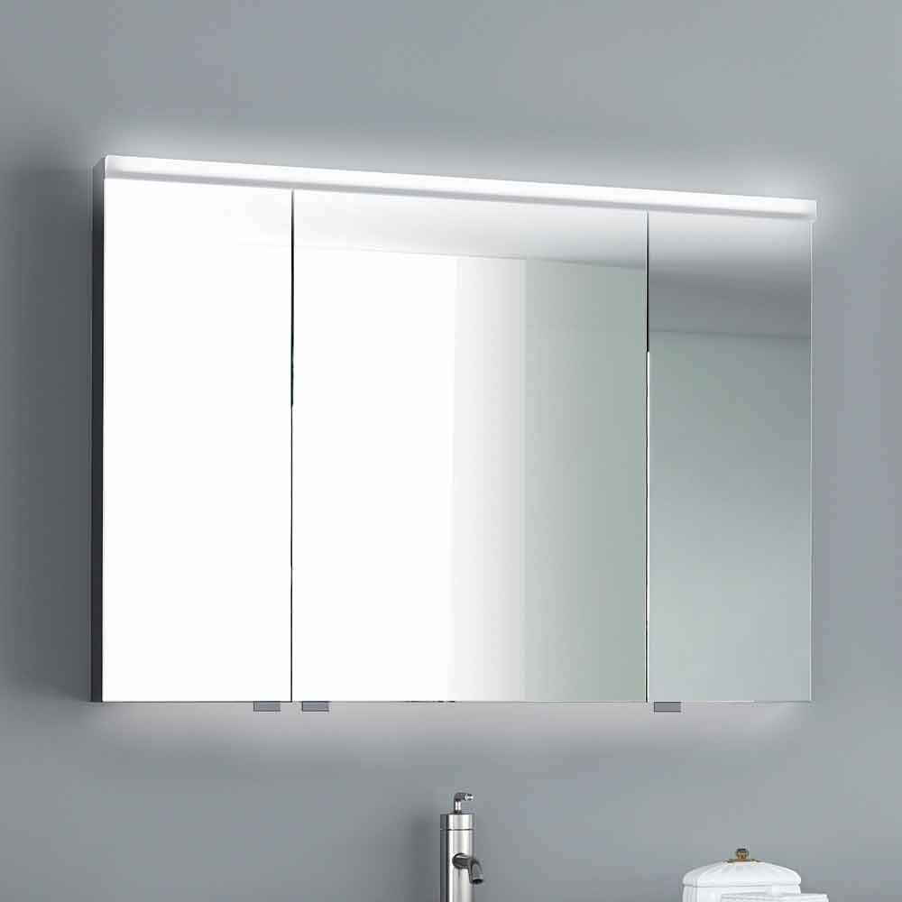 Dollap pasqyre banjoje me tre dyer dhe ndriçim LED. Një vijë e hollë e dritës përcjell një ndriçim të përsosur frontal, i cili mund të kontrollohet lehtësisht nga një sensor.