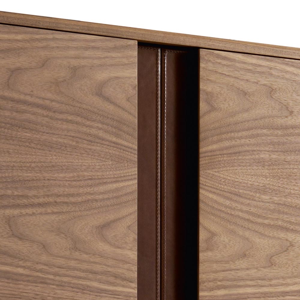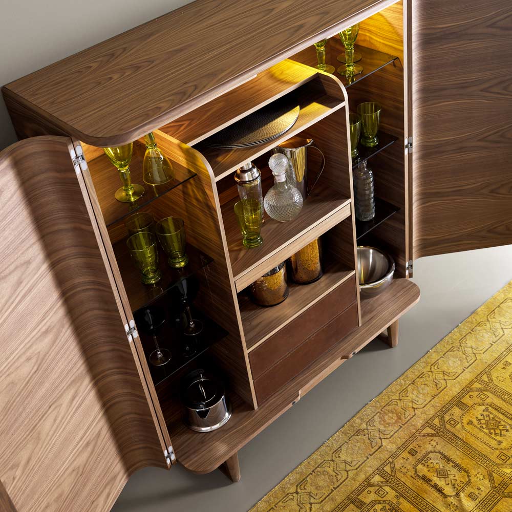 Brenda kabinetit do të gjeni rafte xhami të tymosur, shërbim tërheqës dhe sirtarë, të pajisur me udhëzues rrëshqitës të fshehur me sistemin e heshtur; pjesa e përparme dhe e poshtme e sirtarëve janë të mbuluara me lëkurë natyrale.