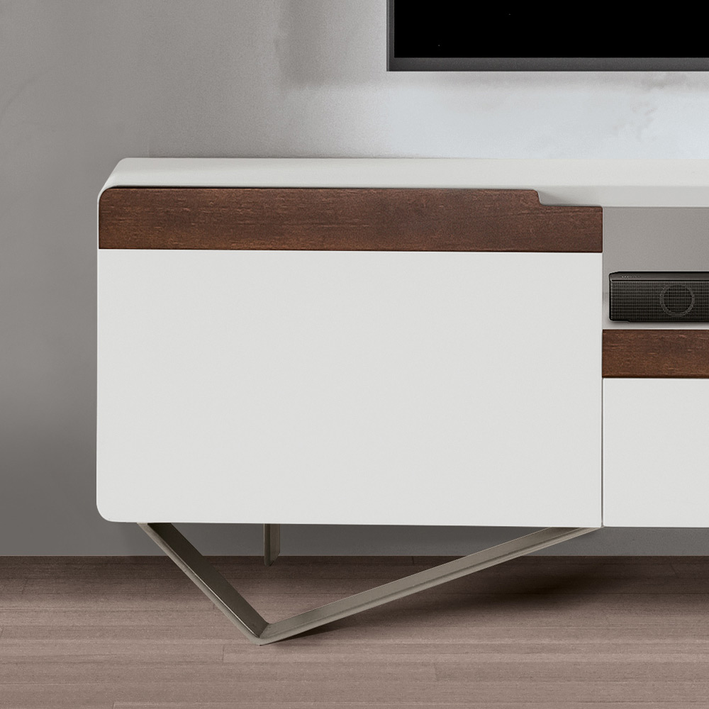 Mbajtësja e televizorit është një aksesor shumë i rëndësishëm mobilimi në çdo shtëpi dhe ka role të shumëfishta: nga mbështetja e televizorit deri te funksioni estetik dhe dekorativ. Produkt modern dhe elegant në MDF të bardhë me këmbë hekuri ngjyrë nikeli , i përbërë nga 2 dyer me ngjyrë të bardhë me skaje druri të fortë tulipani me ngjyrë kanaletto, një sirtar me të njëjtën ngjyrë.dhe një ndarje e hapur që ofron hapësirë shtesë magazinimi.