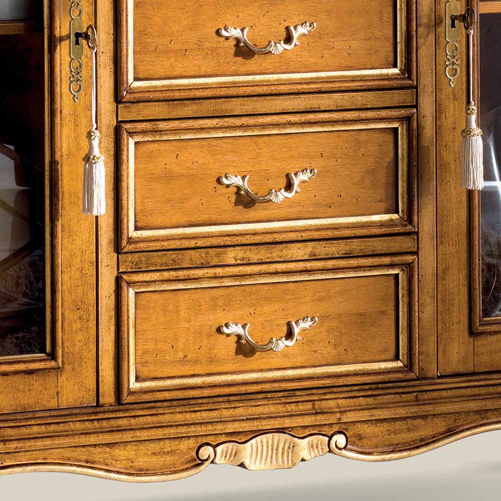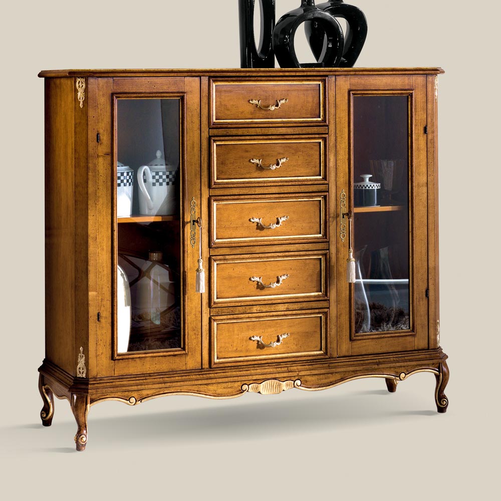 Ekspozimi i dhomës së ndenjes në stilin klasik, i bërë nga arre e çmuar Bassano dhe dru antike ari , me 2 dyer xhami dhe 5 sirtarë. Elegant dhe pa kohë, ky dollap ekrani i stilit klasik është ideal për të krijuar ambiente mbresëlënëse. Prodhuar tërësisht në Itali dhe punuar me dorë nga mjeshtra të aftë , të përfunduara me mençuri dhe shije për elegancë. Prodhimi kryhet duke përdorur materiale të shkëlqyera , dhe duke kryer punënmedorë me kujdesin dhe profesionalizmin maksimal që i dallon produktet Made in Italy .