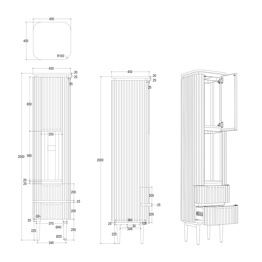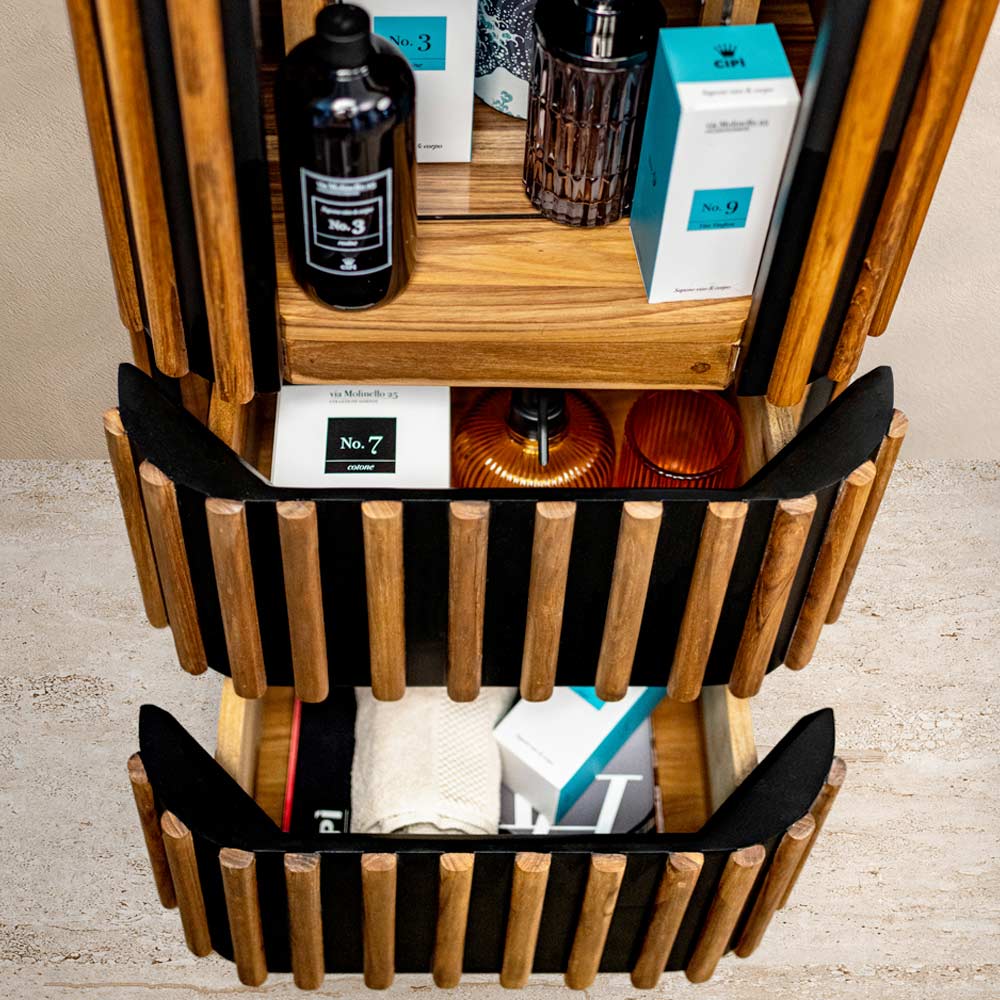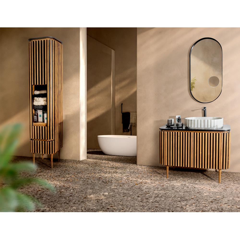Ky dollap banjo me kolonë prej druri të fortë dhe sofër është një xhevahir dizajni, me format e tij të lakuara dhe të lëmuara pa skaje apo doreza të dukshme. Silueta e rrumbullakosur dhe mungesa e detajeve të tepërta krijojnë një estetikë moderne dhe minimaliste, perfekte për një ambient banjosh bashkëkohore. Ajo ofron një derë të madhe, pothuajse të padukshme me mbyllje të ngadaltë që fsheh një hapësirë bujare magazinimi ndërsa hapësira qendrore "e hapur" lidhet me dy sirtarët e çmuar më poshtë. Përzierja e tik të ngrohtë me nuancat e pasura të sofër jep një prekje natyrale dhe klas .