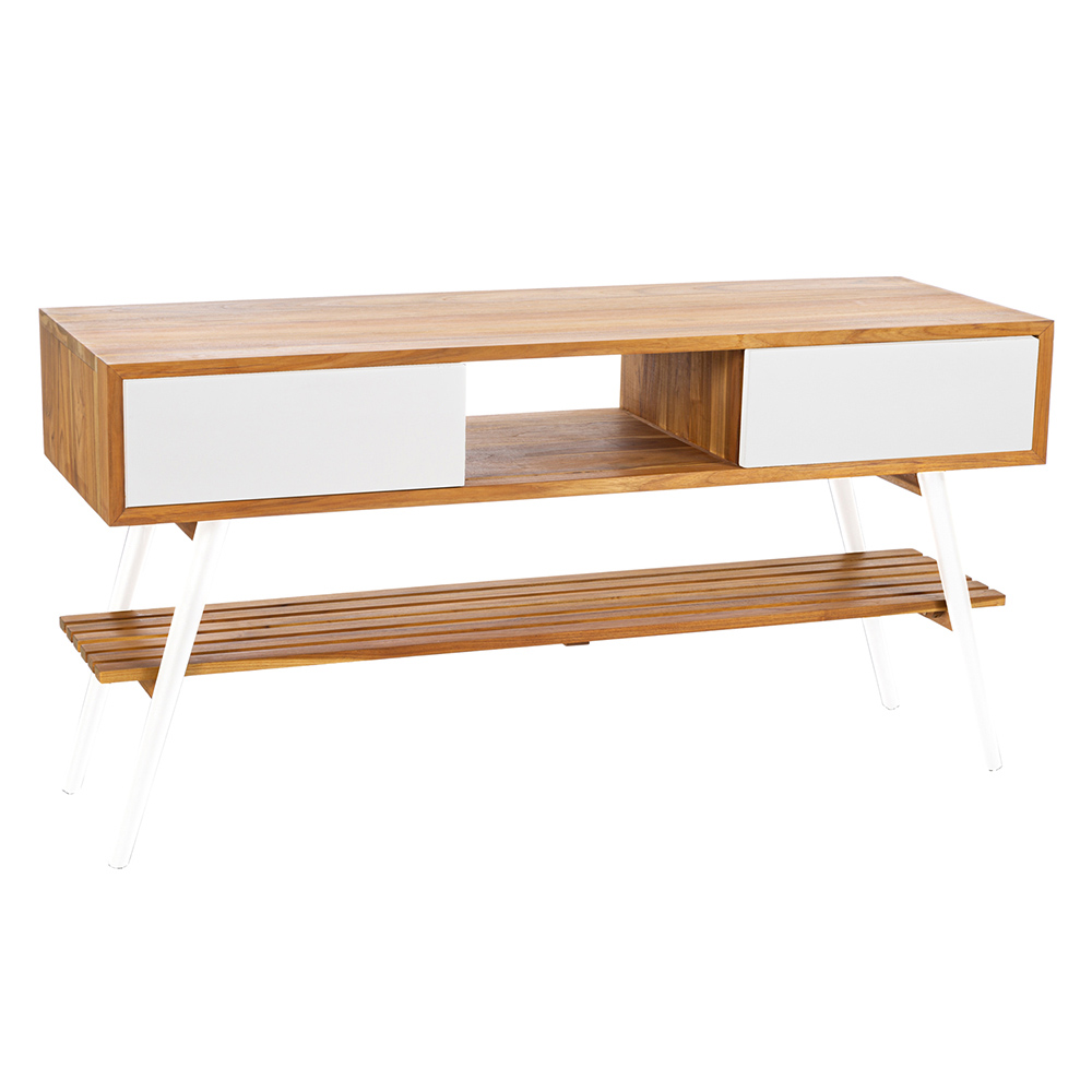 Dollap banjoje në dysheme, i bërë nga dru tik natyral i rikuperuar i kompletuar me 2 sirtarë praktike në dru sofër të lyer me ngjyrë të bardhë mat në të njëjtën ngjyrë me këmbët. Një nuancë e pastër dhe elegante që kujton reflektimin verbues të borës në diell dhe përputhet në mënyrë të përkryer me drurin e dru tik. për një rezultat me një personalitet të fortë skenografik. Një estetikë e qëllimshme grafike e përmirësuar edhe më shumë nga kombinimi i sirtarit të dyfishtë për fasadën.