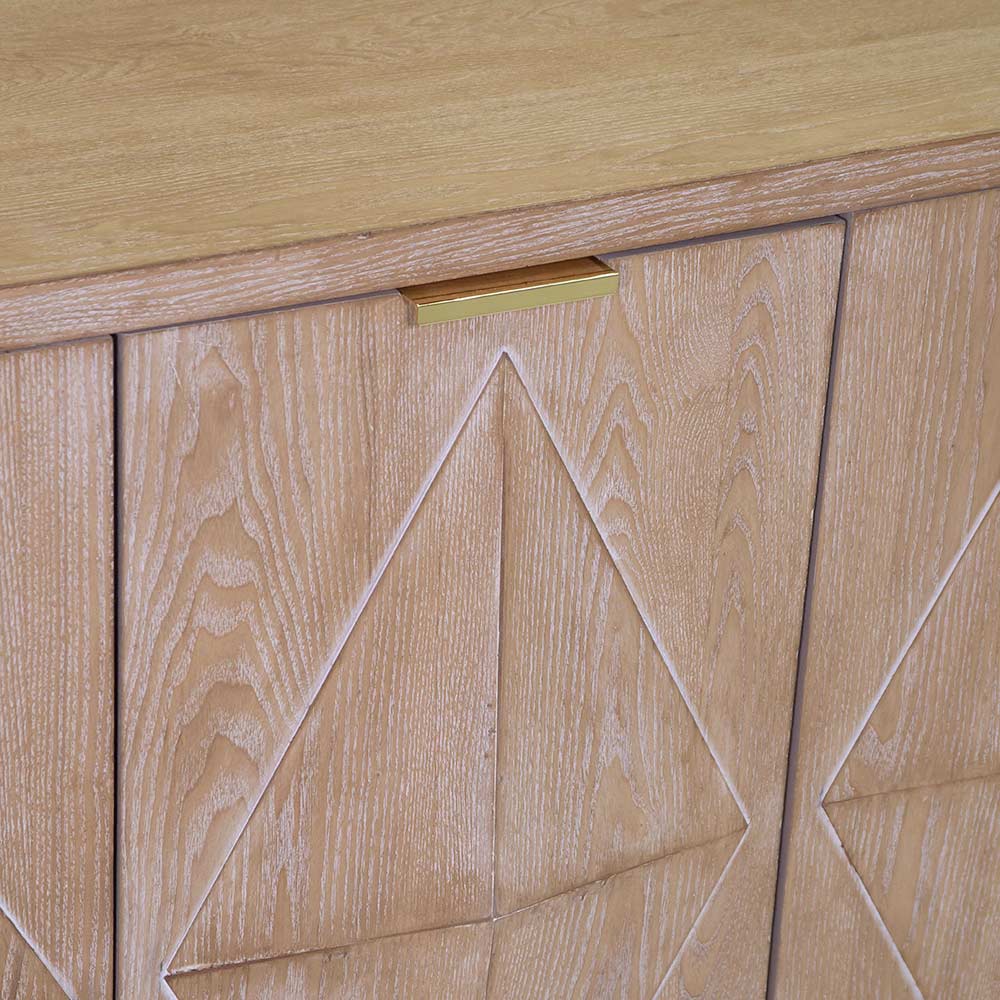 Këmbët e drurit të bredhit i japin kabinetit një strukturë solide, të pasuruar nga një dizajn i pastër dhe bashkëkohor. Dyert, të zbukuruara me një model gjeometrik të gdhendur, shtojnë një prekje origjinaliteti dhe sqimë.