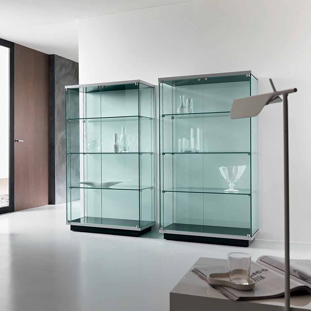 Dollapi i ekranit me dy dyer me kyç është tërësisht prej xhami të zbutur transparent me tre rafte me bazë, majë dhe bazament në dru të zi të llakuar.