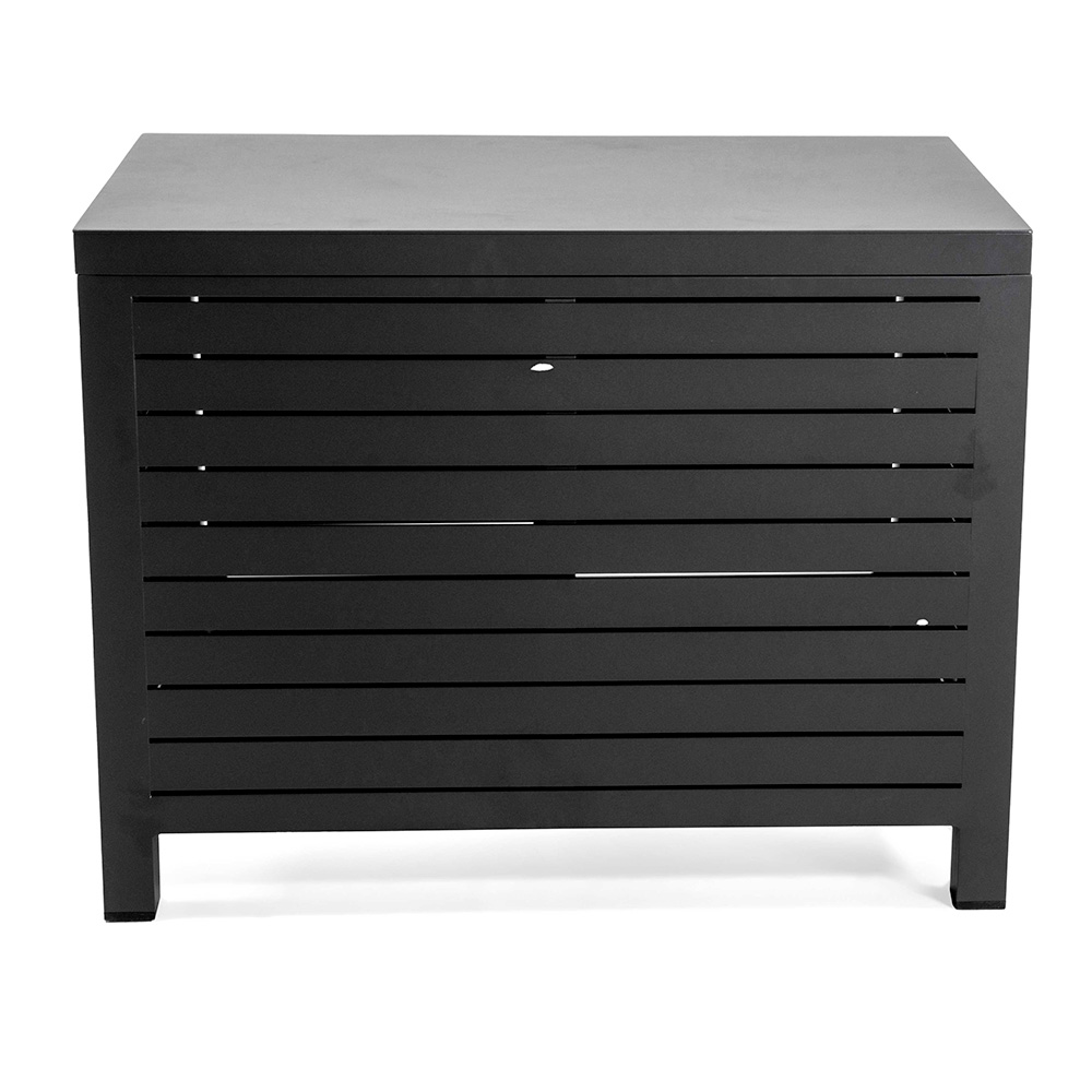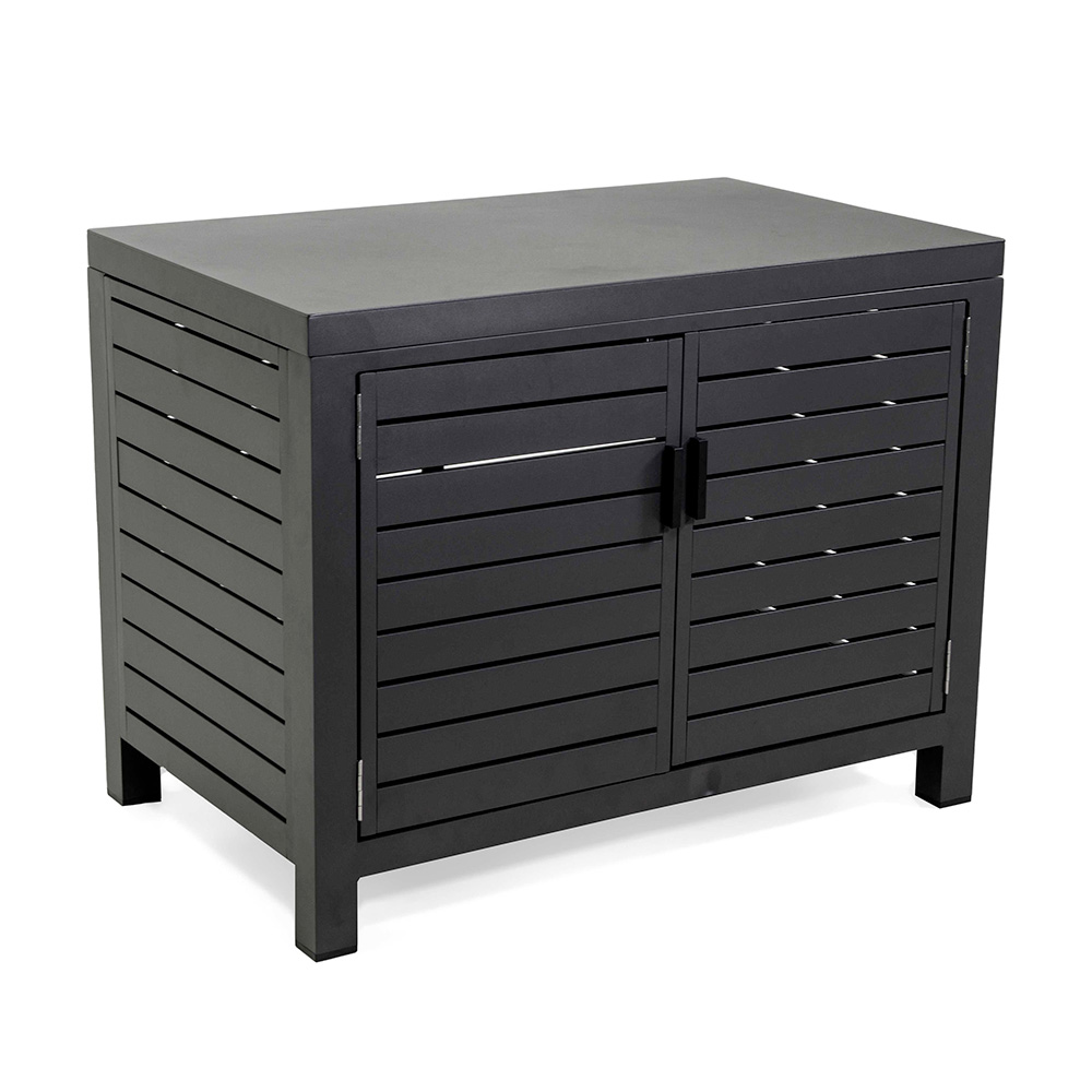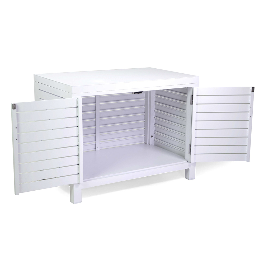 Shtoni një prekje elegance moderne në hapësirën tuaj të jashtme me këtë kabinet të sofistikuar prej alumini , i cili do të përshtatet në mënyrë të përkryer në çdo ambient të jashtëm. Dizajni me shirita të pastër krijon një efekt vizual tërheqës, duke e bërë atë një element qendror funksional dhe dekorativ.