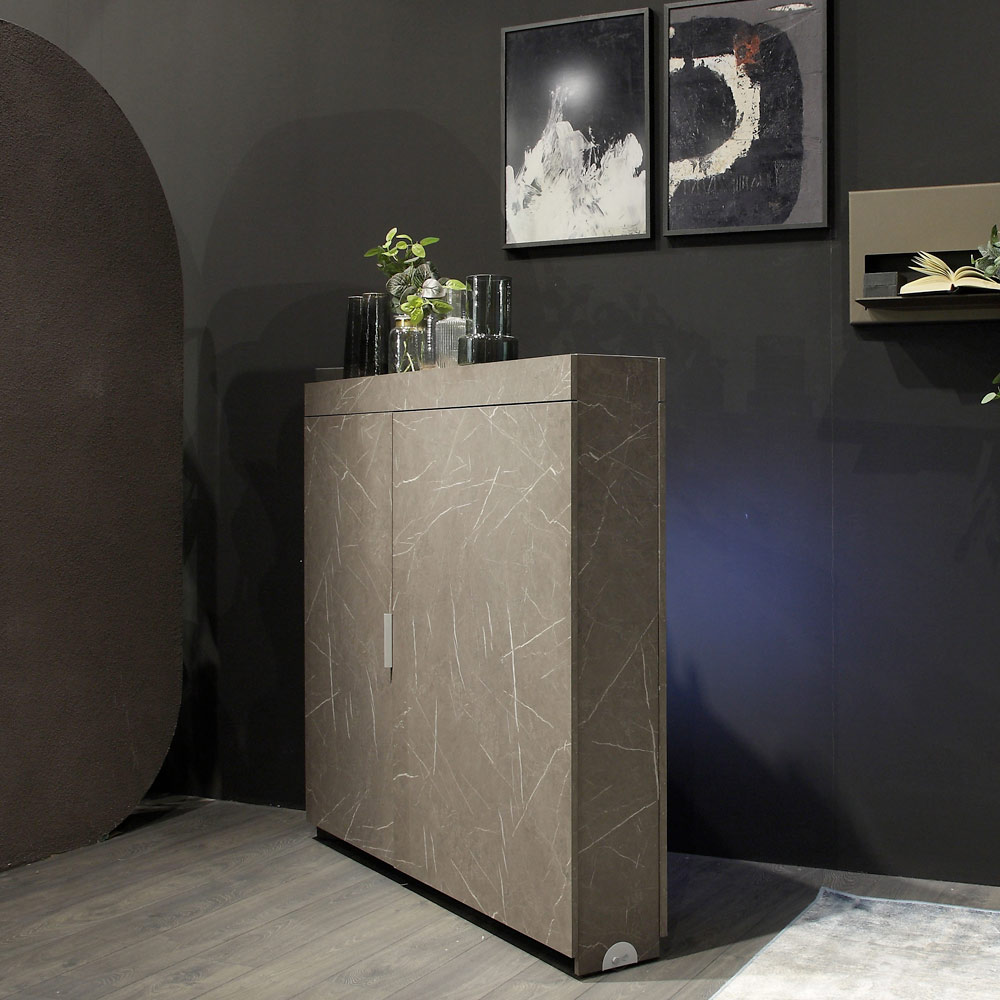 Dollap rrotullues multifunksional me kornizë metalike në fund të stampuar grafit , strukturë dhe dyer në melamine . Ofrohet fiksimi i murit djathtas ose majtas. Kjo pjesë e mobiljeve ka një ndarje TV në njërën anë me një kapacitet televizori maksimal prej 40 inç, e përkryer për të shijuar momente argëtimi familjare. Nga ana tjetër, dy dyer, njëra me një tavolinë të integruar të nxjerrshme dhe tjetra me një ndarje për karriget e palosshme , të përshtatshme për të pritur dhe krijuar momente të paharrueshme komoditeti. Kjo është pjesa klasike e mobiljeve që kursen hapësirë që mund të vendoset në çdo zonë banimi për të optimizuar hapësirat dhe për t'u përshtatur me çdo rast dhe kërkesë përdorimi. Është praktik dhe funksional dhe ka të gjithë cilësinë e një produkti Made in Italy.