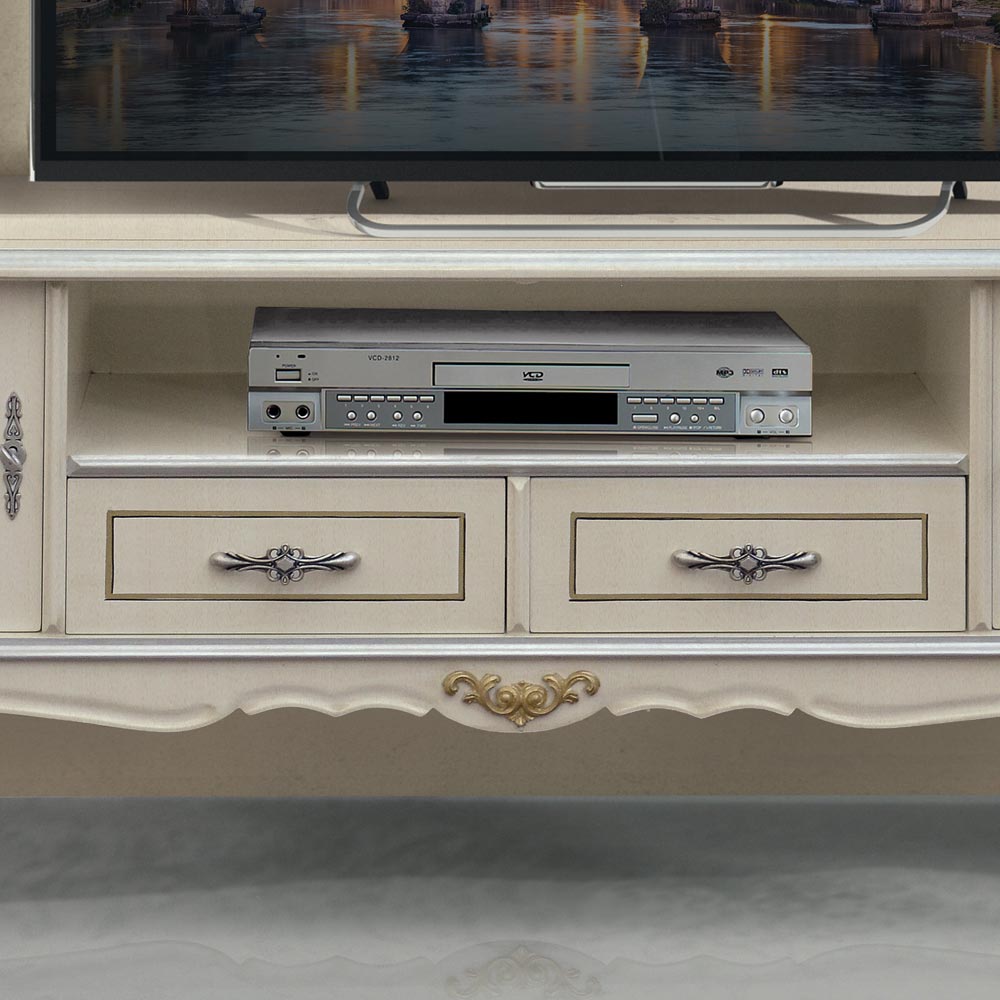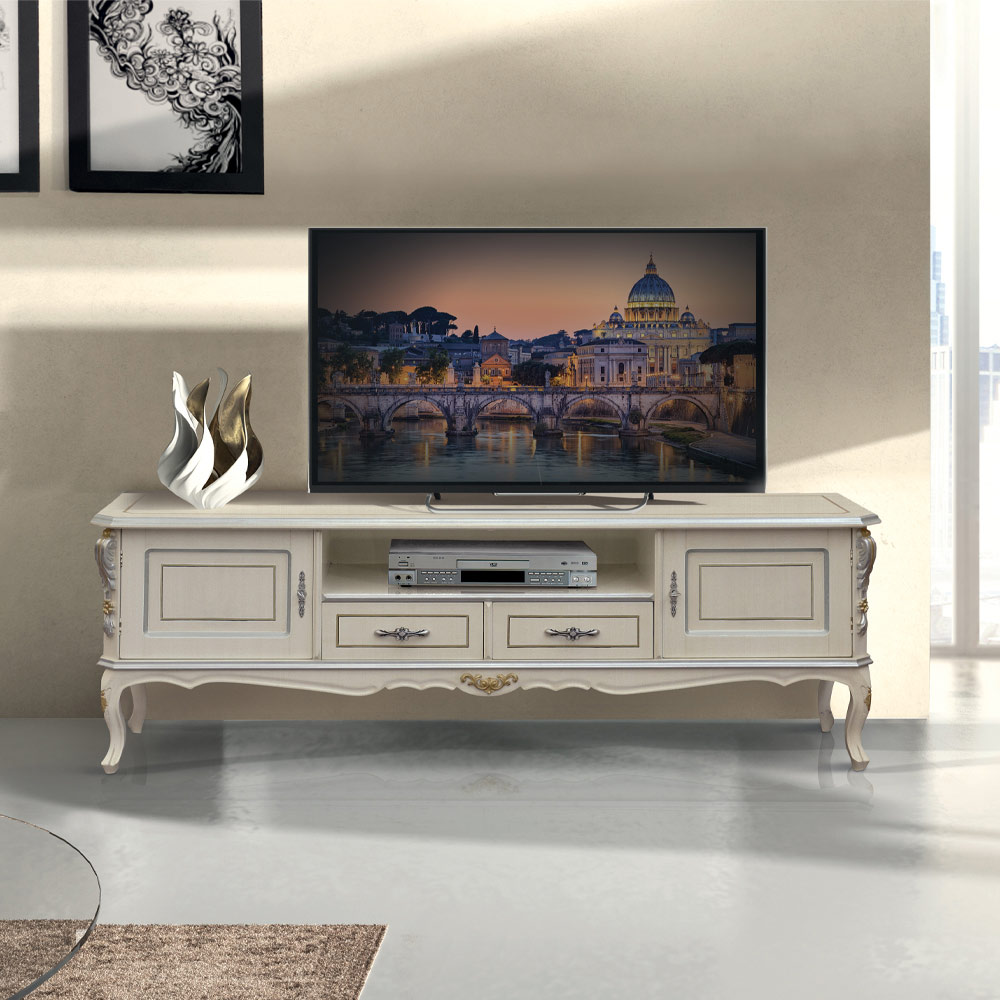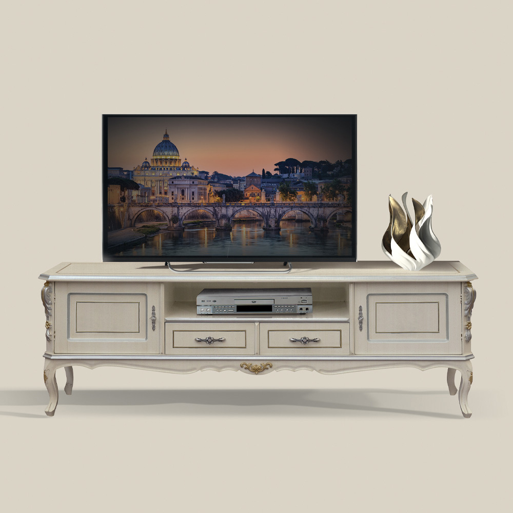 Një mbajtëse televizori e pavarur e punuar nga dru i bardhë me detaje argjendi , e disponueshme me 2 dyer dhe 2 sirtarë ose 2 dyer, 1 sirtar dhe 1 ndarje, është perfekte për çdo dhomë ndenjeje. Stili dhe mjeshtëria që karakterizojnë punimin shkëlqejnë në këtë mobilje luksoze të punuar nga dru i cilësisë së lartë, një aksesor i rafinuar që do të përmirësojë çdo hapësirë.