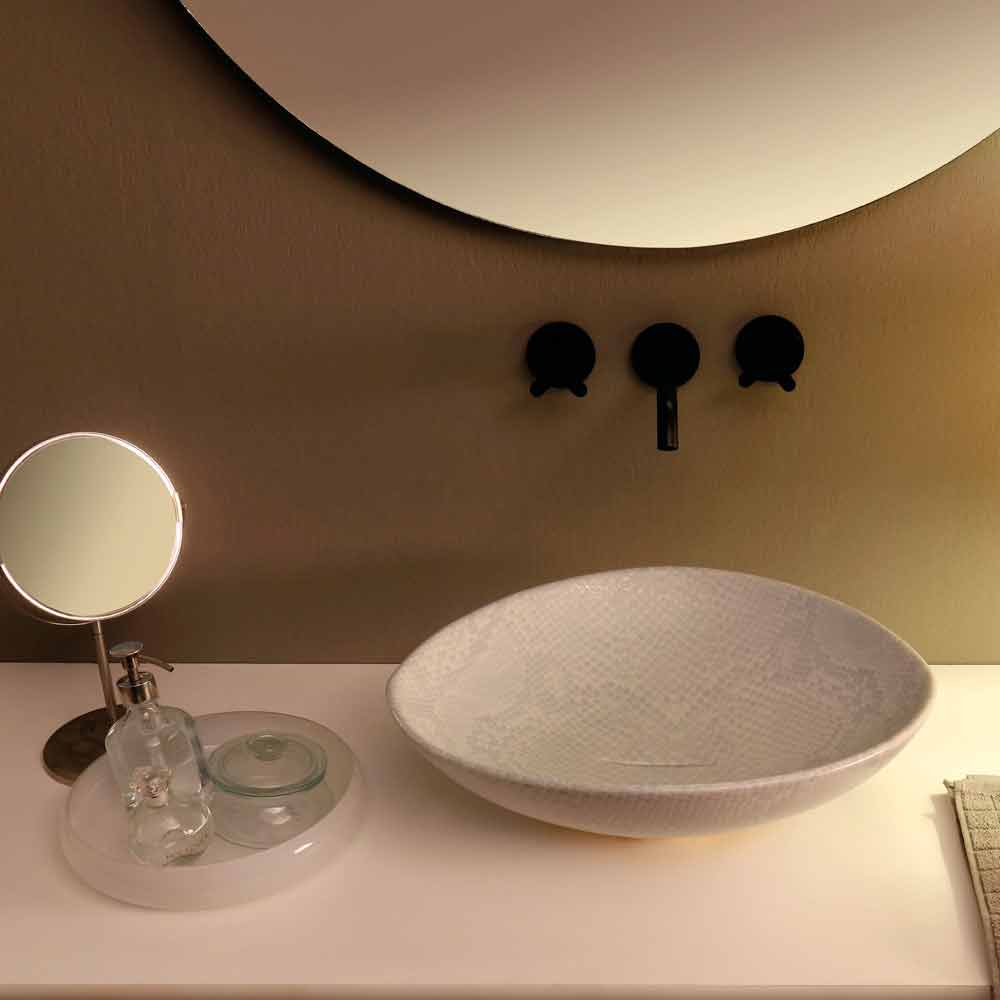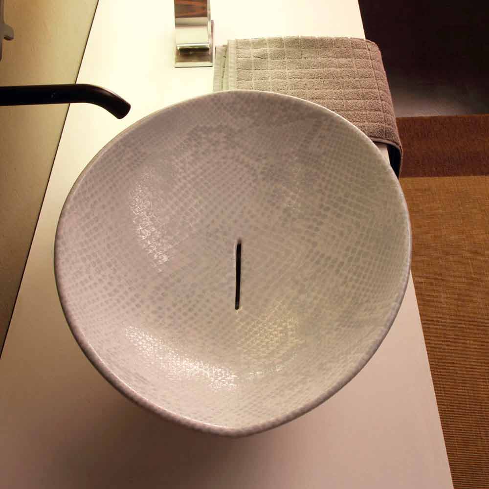Dizajnoni lavamanin e tavolinës me qeramikë të bardhë pitoni të bërë nga Italy Animals Lavaman ose "legen" me formë të parregullt, që të kujton një seksion bajame, të pajisur me një kullim të vazhdueshëm uji. Ky lavaman mund të personalizohet duke zgjedhur midis përfundimeve dhe dekorimeve të ndryshme: për të kërkuar informacion dhe / ose një kuotë të personalizuar, shkruani në clienti@viadurini.it.