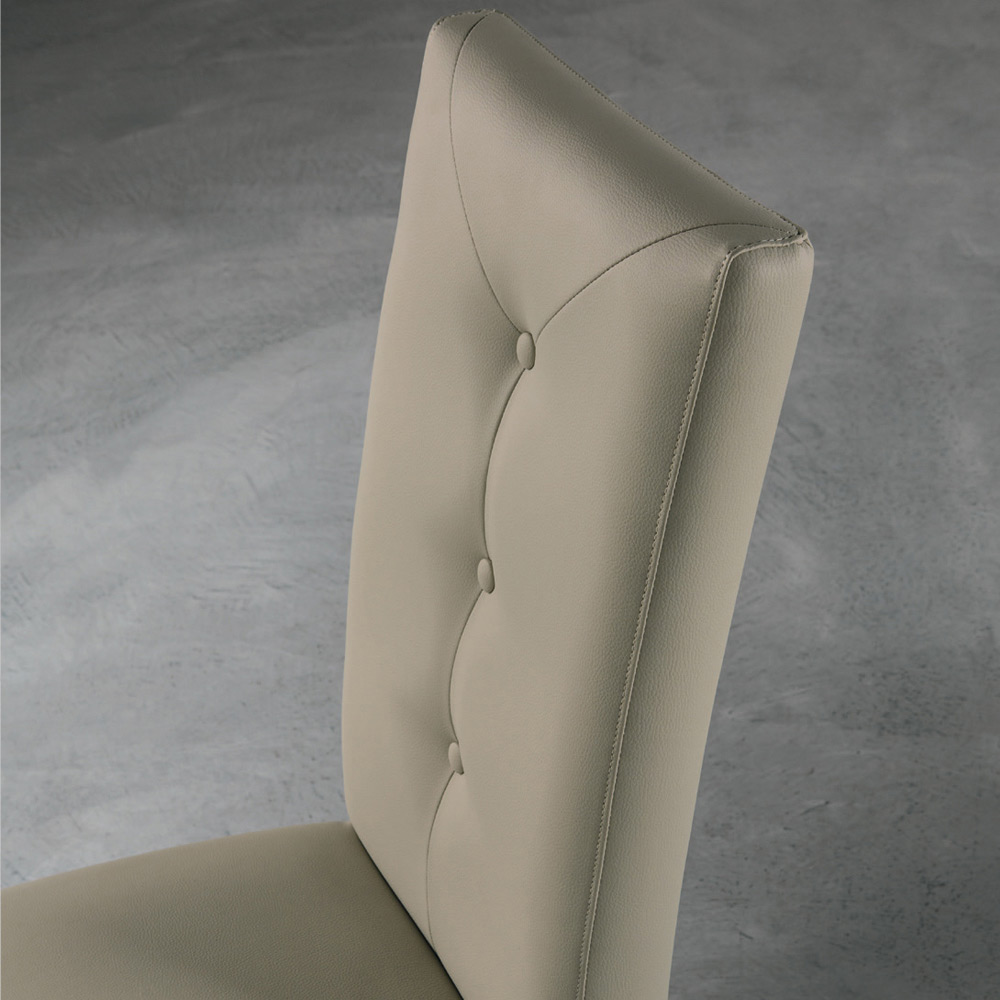 Kjo karrige e dhomës së ndenjes është e prodhuar në Itali me strukturë druri ahu të lakuardhe disponohet në përfundime të ndryshme që mbështet sediljen eko-lëkurë me butona në pjesën e pasme. Dizajni i tij modern dhe elegant karakterizohet nga linja të pastra dhe të thjeshta që sigurojnë rehati maksimale duke garantuar një shije të lartë estetike.