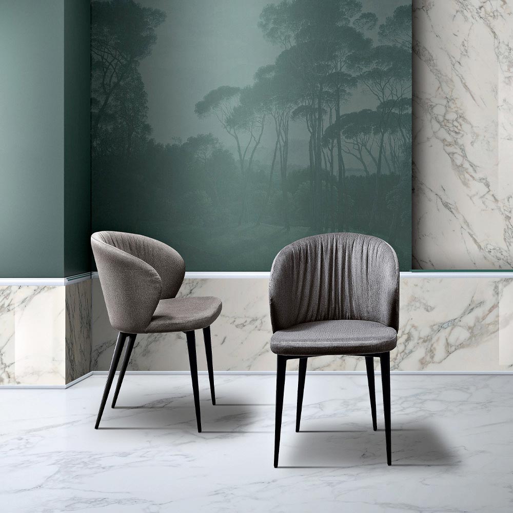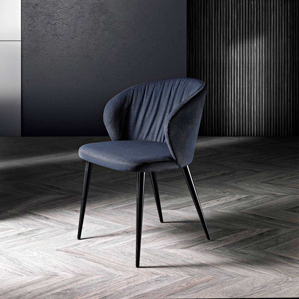 Karrige vaske me dizajn modern, e mbuluar me pëlhurë me ngjyrë dhe këmbë metalike konike, e prodhuar në Itali.