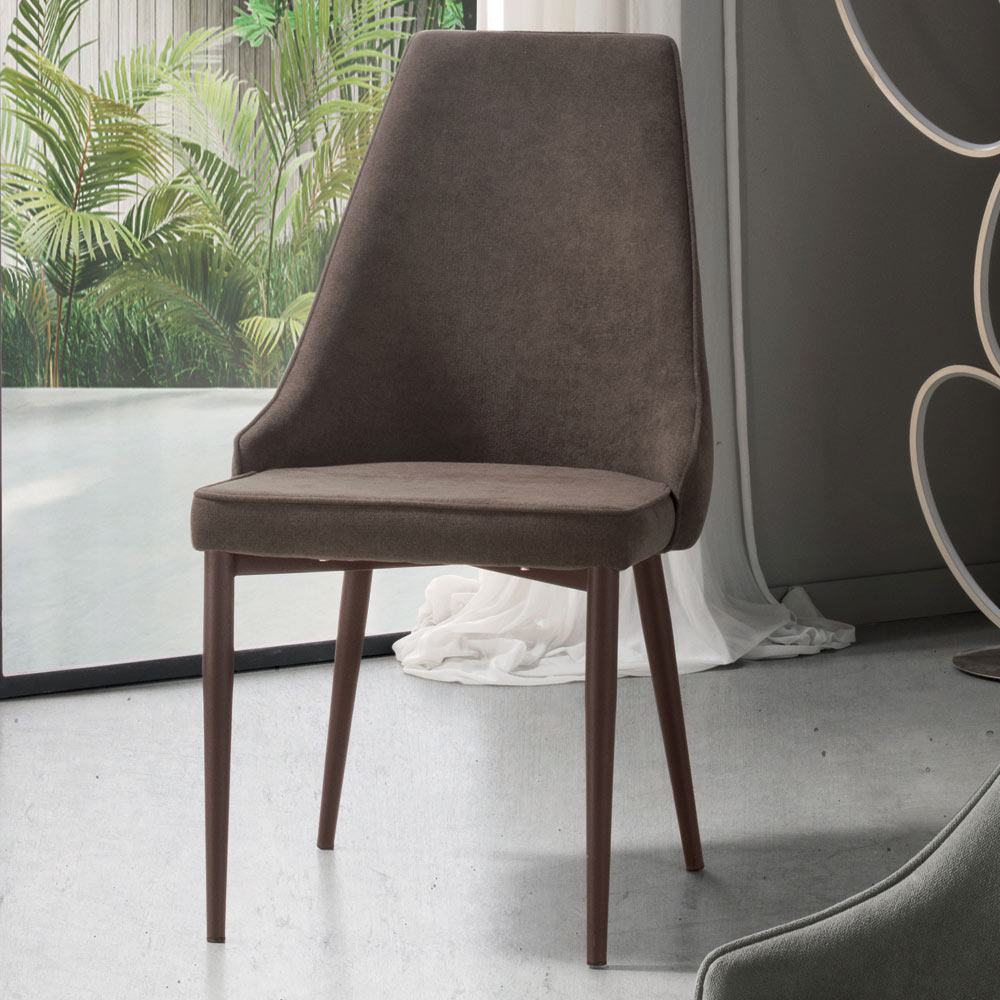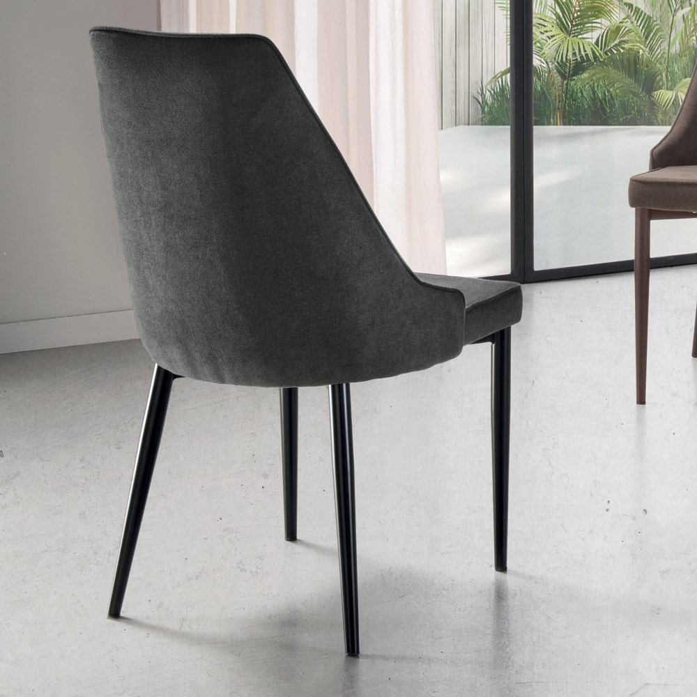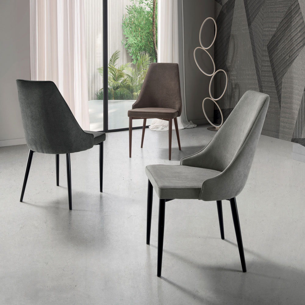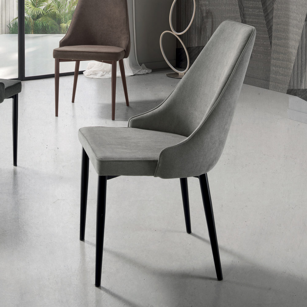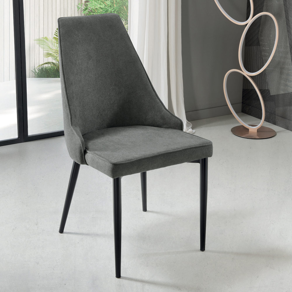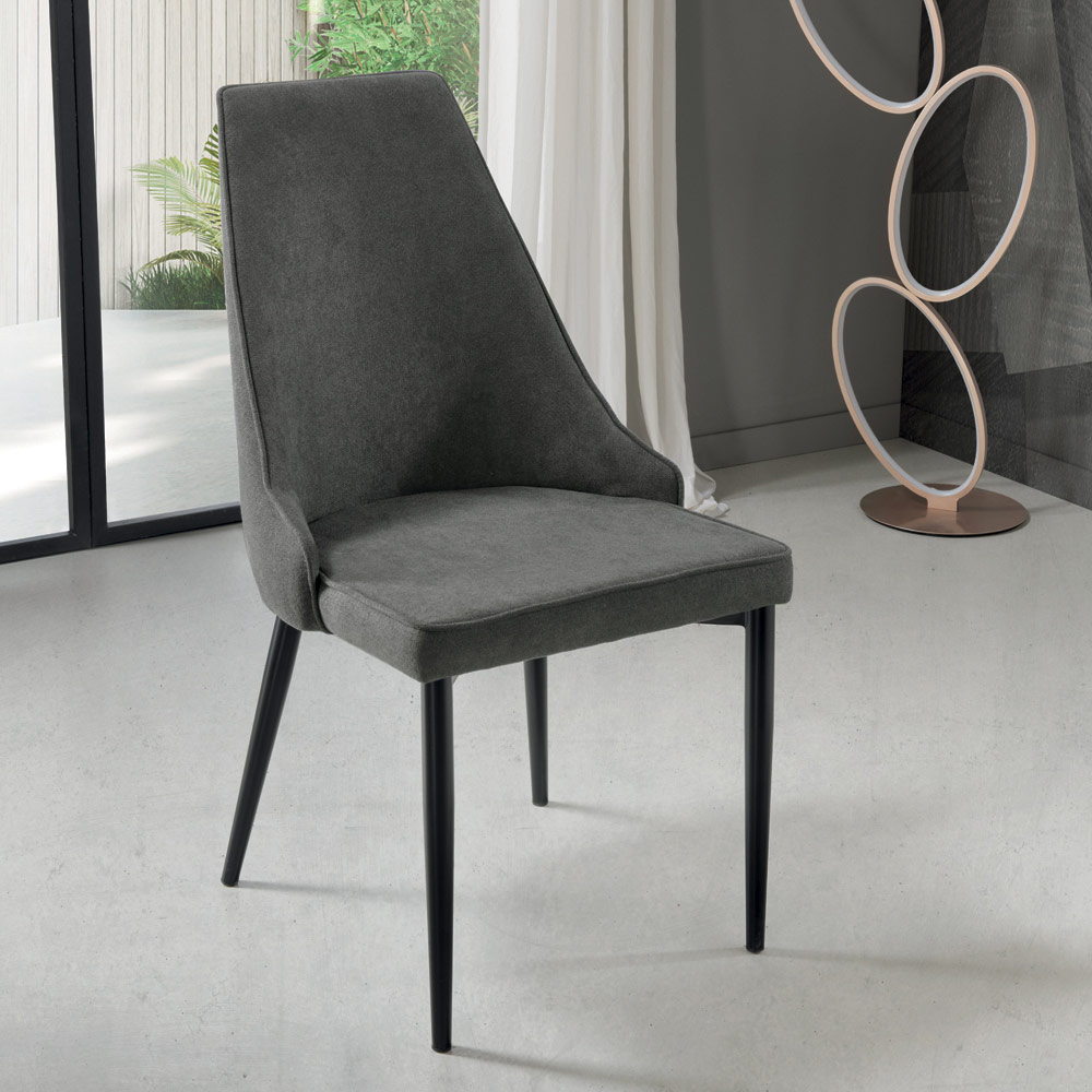 Karrige e dhomës së ngrënies me ndenjëse të mbuluar me pëlhurë dhe strukturë metalike . Një mobilje elegante dhe me klas që gjen vendndodhjen e saj perfekte brenda hapësirave shtëpiake të stilit bashkëkohor . Silueta e saj e hollë dhe e zbehtë karakterizon të gjithë figurën e sediljes së bashku me formën e veçantë të mbulesës së pëlhurës që e bën atë unike në llojin e saj dhe e pasuron estetikën e saj në një mënyrë origjinale.