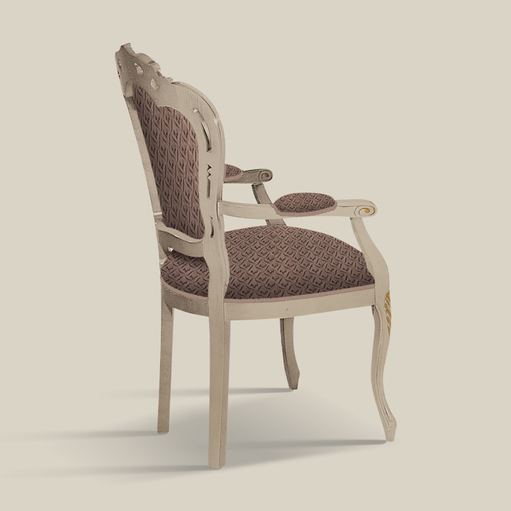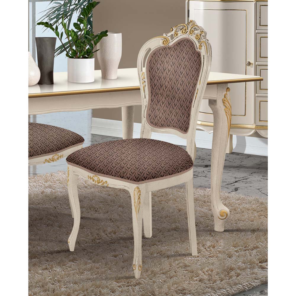 Karrige e dhomës së ngrënies në stil klasik, e punuar me dru të çmuar në fund të bardhë dhe mbushje prej pëlhure , e disponueshme në versionin me ose pa mbështetëse krahësh. I gjithë stili dhe mjeshtëria që karakterizon punimin shfaqen në këtë mobilje luksoze duke e bërë atë një plotësues të rafinuar të aftë për të zbukuruar mjedisin në të cilin është vendosur. Prodhuar tërësisht në Itali dhe punuar me dorë nga mjeshtra të aftë , të përfunduara me mençuri dhe shije për elegancë. Prodhimi kryhet duke përdorur materiale të shkëlqyera , dhe duke kryer punënmedorë me kujdesin dhe profesionalizmin maksimal që i dallon produktet Made in Italy .