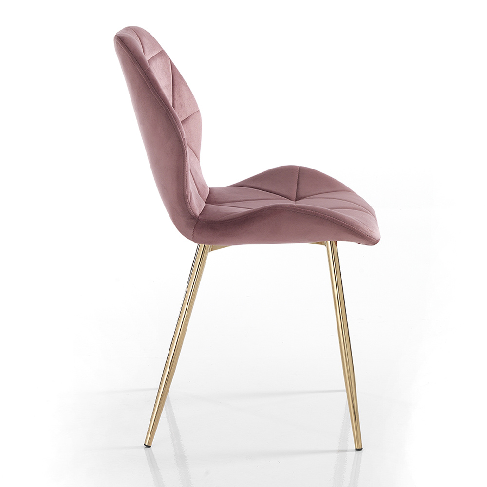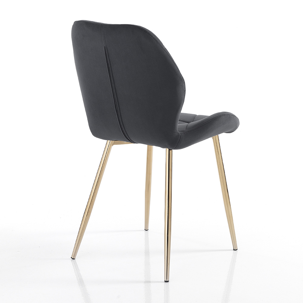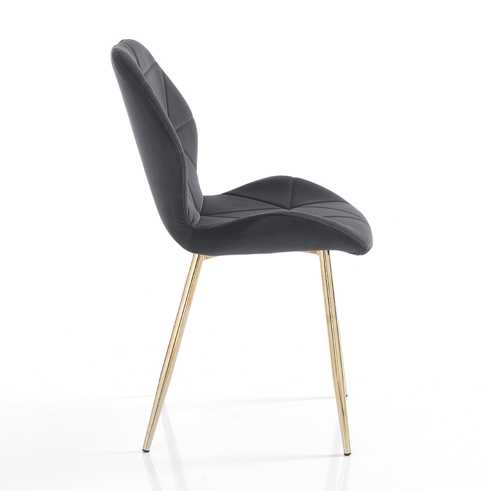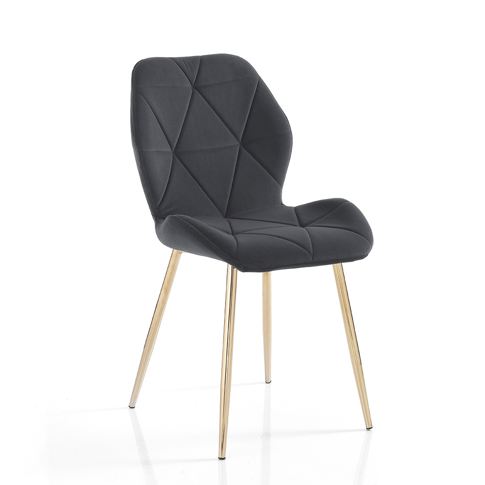 Karrige e dhomës së ngrënies me këmbë prej metali të lyer me ar me shkëlqim dhe ndenjëse e veshur me pëlhurë me efekt kadife . Një dizajn origjinal dhe bashkëkohor ideal për ata që duan të arredojnë hapësirat e tyre me personalitet dhe një prekje krijuese. Tekstura e veçantë gjeometrike që mbulon sediljen e pasuron edhe më shumë estetikën e saj ndërsa kombinimi i mrekullueshëm i përfundimeve dhe materialeve nënvizon elegancën dhe shpirtin romantik të saj . Ideale për të kompletuar dhomat e ngrënies dhe kuzhinat moderne por edhe hapësirat e kontraktuara si bare dhe restorante ku krijon një atmosferë mikpritëse dhe siguron rehati optimale .