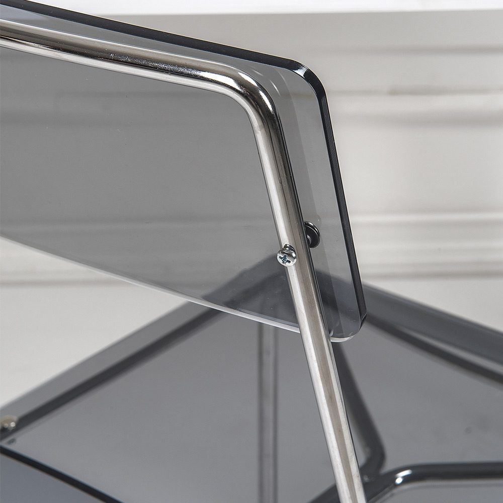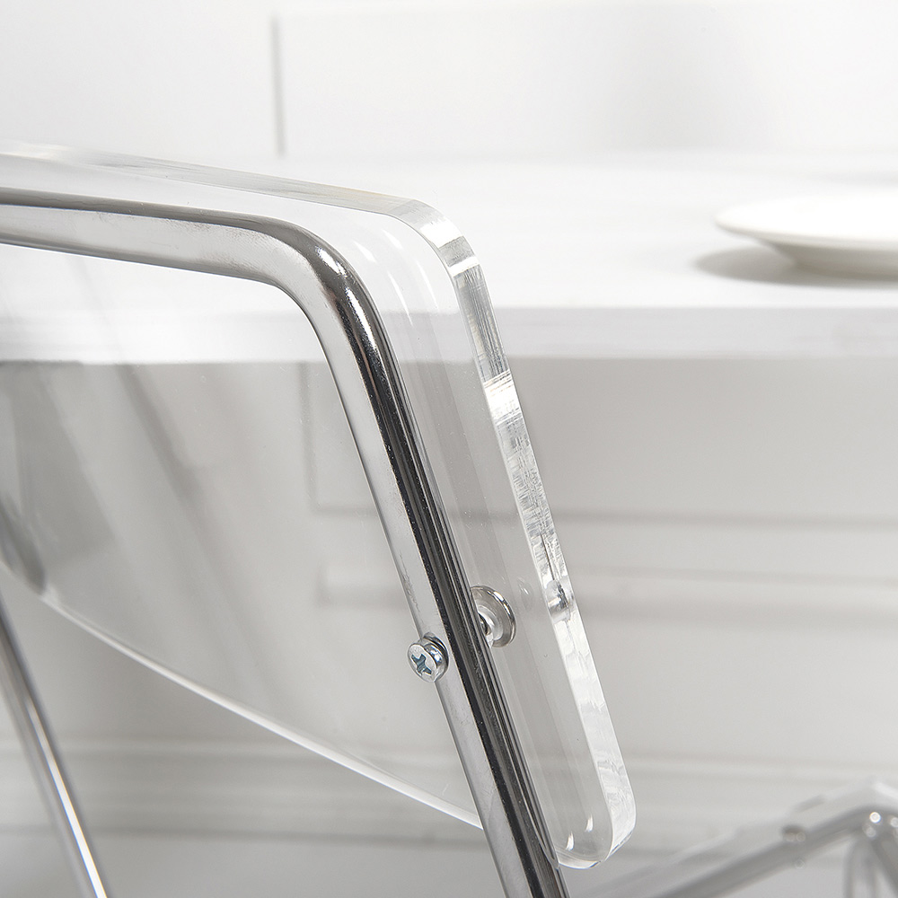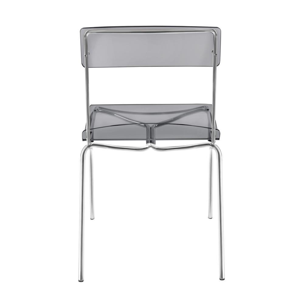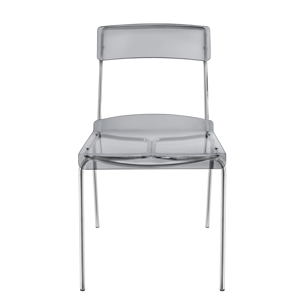 Karrige e dhomës së ngrënies me guaskë pleksiglas dhe strukturë metalike të kromuar argjendi , tërësisht e prodhuar në Itali . Një zgjidhje ideale mobilimi për ata që kërkojnë thjeshtësi dhe shkathtësi përdorimi për të qenë në gjendje të arredojnë hapësirat e tyre shtëpiake me një karakter modern dhe funksionalitet të lartë . Forma e strukturës bën të mundur edhe grumbullimin e tyre, duke e bërë kështu një ide perfekte edhe për hapësirat me kontratë si bare dhe restorante.