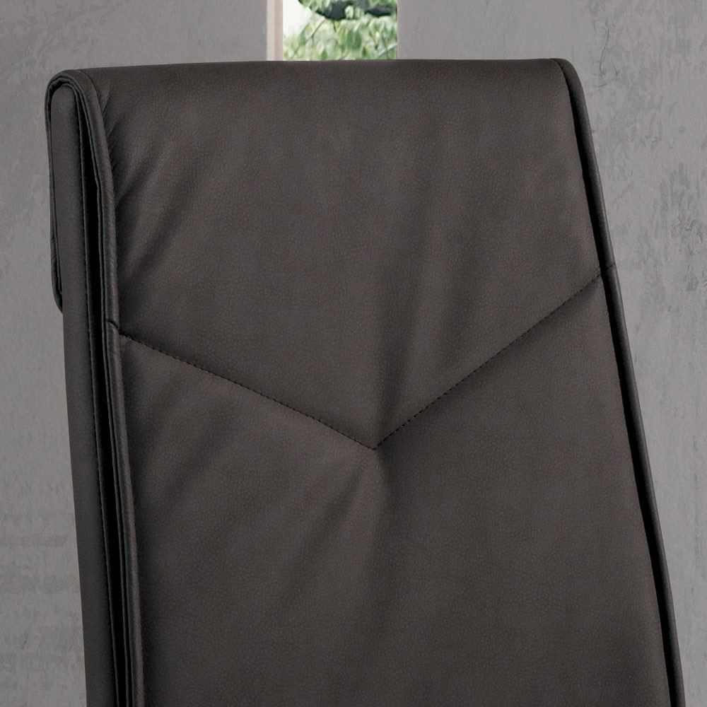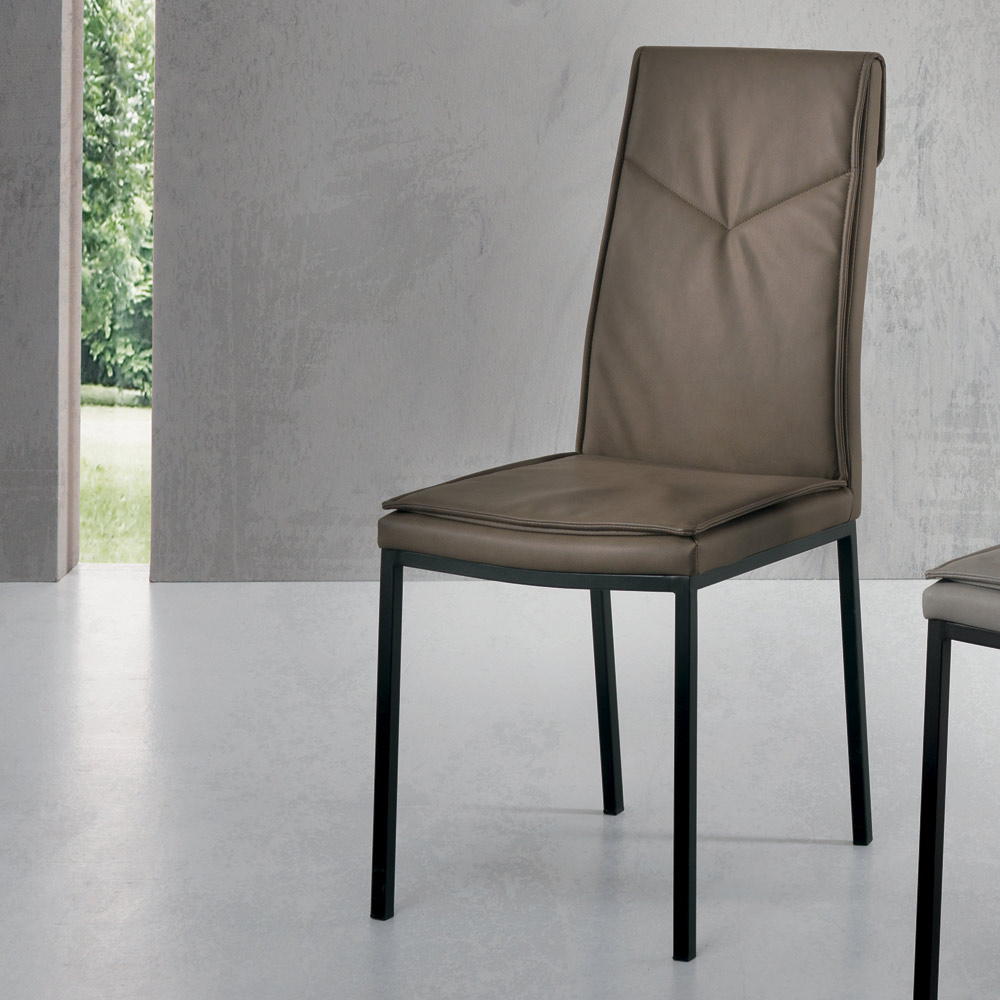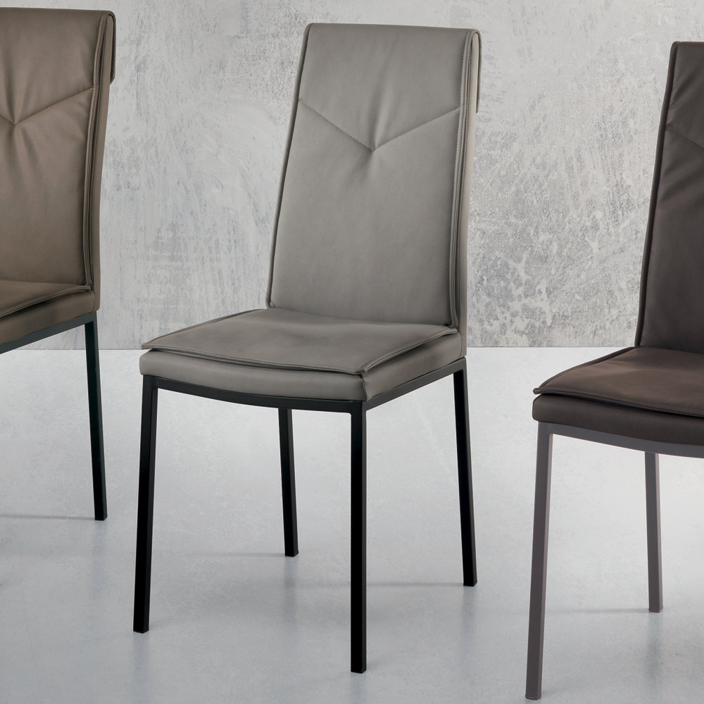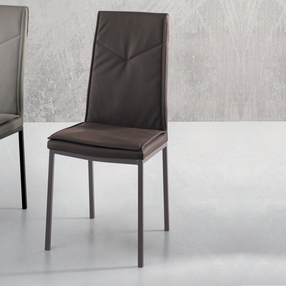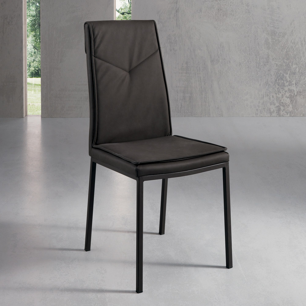 Karrige e dhomës së ngrënies me sedilje të mbushur, e mbuluar me lëkurë eko të punuar me çekiç dhe strukturë metalike të lyer . Një karrige me potencial të papritur e karakterizuar nga forma dhe linja të thjeshta dhe elegante dhe një stil imponues dhe i rafinuar . Përdorimi i metalit për ndërtimin e këmbëve i ofron produktit qëndrueshmëri dhe qëndrueshmëri duke rritur kështu anën e tij funksionale ndërsa tapiceri prej lëkure rrit vlerën e tij duke kompletuar estetikën e tij përmes një prekjeje ekskluzive dhe të rafinuar .