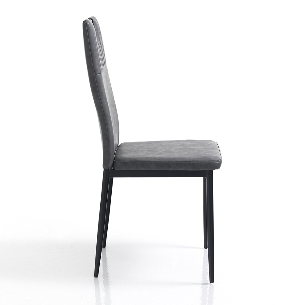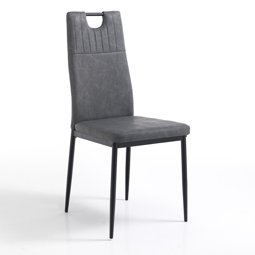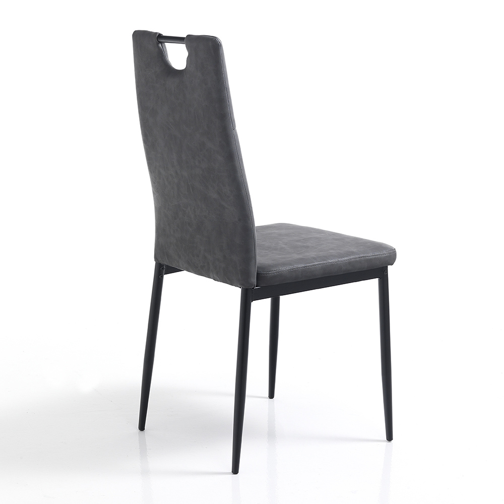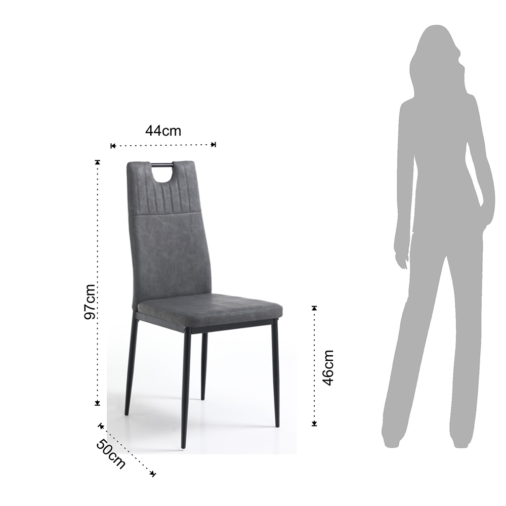 Karrige për dhomën e ngrënies ose kuzhinën prej metali të lyer me ngjyrë të zezë mat me ndenjëse të mbuluar me lëkurë sintetike me efekt të vjetëruar . Falë dizajnit të tij unik dhe të rafinuar, ai kompleton arredimin e dhomës me shije dhe rafinim, pa anashkaluar asnjëherë aspektin funksional. Konformiteti i tij në fakt ofron një ndenjëse veçanërisht të butë, të rehatshme dhe mikpritëse , duke kombinuar kështu anën praktike dhe estetike në një mënyrë të shkëlqyer për një rezultat ekskluziv dhe dizajni .