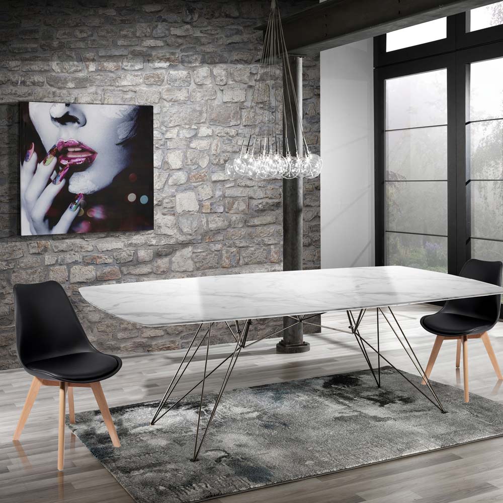 Karrige për dhomën e ngrënies ose kuzhinën me këmbë prej druri të fortë me fije lisi , guaskë prej polipropileni opak dhe sedilje e veshur me susta dhe e mbuluar me lëkurë sintetike . Një produkt që përfaqëson kombinimin perfekt të dizajnit dhe komoditetit , duke i dhënë kështu jetë një ndenjëseje mikpritëse, moderne dhe inovative, ideale për të arreduar ambiente shtëpiake por edhe të kontraktuara me një prekje ekskluzive, të sofistikuar dhe avangarde .