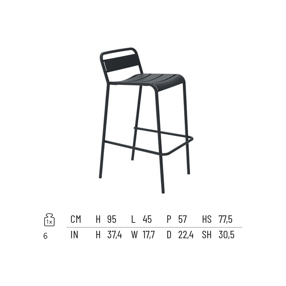 Stol për jashtë , i prodhuar tërësisht në Itali , me hekur të galvanizuar të lyer me pluhur, i kompletuar me mbështetëse për këmbët praktike dhe të rehatshme dhe strukturë që mund të grumbullohet . Një aksesor mobilimi i karakterizuar nga qetësia dhe freskia, karakteristika që kujtojnë vitet '60 në një stil bashkëkohor për një rezultat origjinal dhe veçanërisht eklektik.