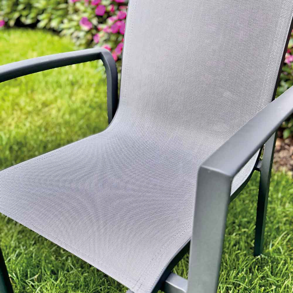 Korniza e lyer e aluminit është e fortë, por e lehtë, rezistente ndaj ndryshkut dhe agjentëve atmosferikë, e përkryer për të jetuar jashtë pa shqetësime. Sedilja dhe mbështetësja prej tekstili , një pëlhurë teknike e ajrosur dhe fleksibël, garantojnë rehati ergonomike edhe pas orëve të përdorimit, duke u përshtatur butësisht me trupin.
