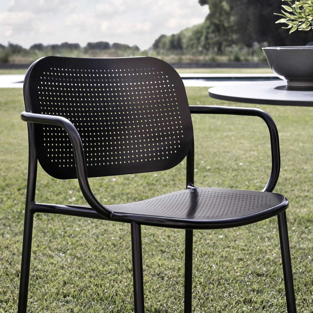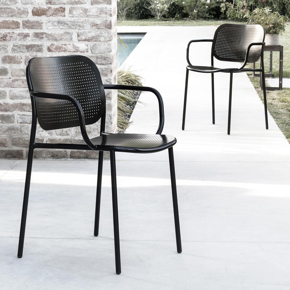Karrige e jashtme e stivueshme me strukturë tubulare metalike të lyer e kompletuar nga sedilja dhe mbrapa në llamarina me teksturë të shpuar, një efekt që riviziton thurjen klasike vjeneze në një çelës bashkëkohor. E bërë përmes një procesi prodhimi 100% Made in Italy , kjo karrige ofron qëndrueshmëri të shkëlqyer falë përdorimit të lëndëve të para me cilësi të lartë dhe trajtimit të veçantë të metalit që e bën përfundimin e produktit veçanërisht rezistent ndaj agjentëve atmosferikë.