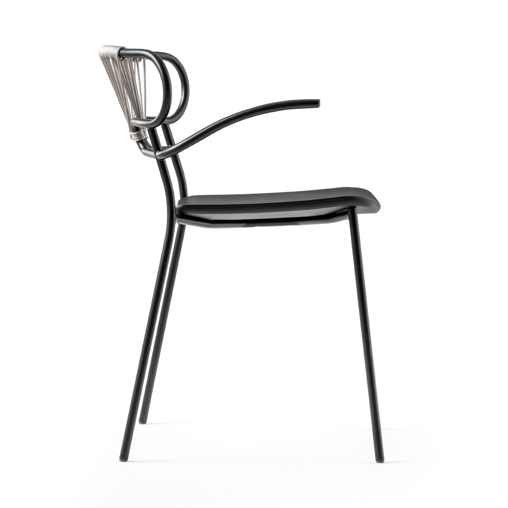 Karrige për dhomën e ngrënies ose kuzhinën prodhuar në Itali me strukturë metalike të pikturuar në të zezë dhe litar gri me sedilje të zezë të llakuar prej druri. Një zgjidhje origjinale e arredimit në thjeshtësinë e saj, e pasuruar dhe e bërë unike nga forma e veçantë e mbështetëses së mbështetur të marrë përmes lakimit të një tubi të vetëm metalik dhe nga detaji i thurur në litar që jep një personalitet origjinal dhe ekstrovert. Falë përfundimeve neutrale dhe thelbësore të saj, kjo karrige është një zgjidhje e përkryer për mjedise moderne ku kërkohet një ide funksionale dhe krijuese që nuk kalon pa u vënë re ndërsa mbetet diskrete ndërsa ofron gjithashtu mundësinë e grumbullimit për të optimizuar hapësirën tuaj në maksimum.