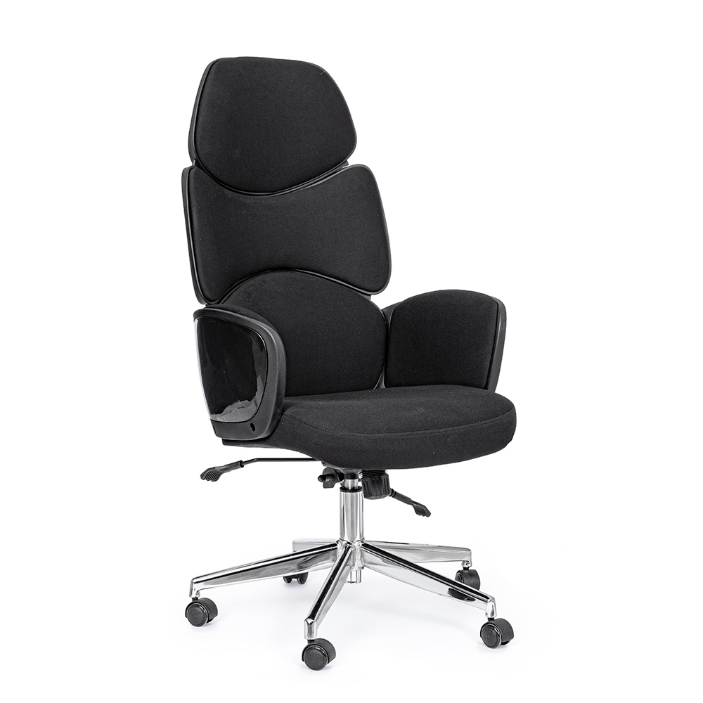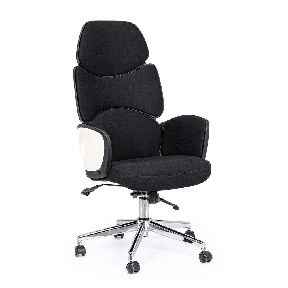 Ky kolltuk zyre është bërë me bazë solide prej çeliku të kromuar me diametër 35 cm dhe rrota plastike (poliuretani). Trupi dhe mbështetësit e krahëve në plastikë (polipropileni). Mbulim me pëlhurë 100% poliestër. Mekanizmi shumëfunksional: rregullimi i lartësisë me piston gazi dhe funksioni i sinkronizuar i shtrirjes (kyçja e mbështetëses në pozicionin e dëshiruar).