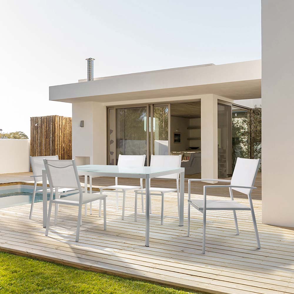Karrige kopshti e grumbullueshme nga alumini dhe tekstili i bardhë ose gri - Floraforma