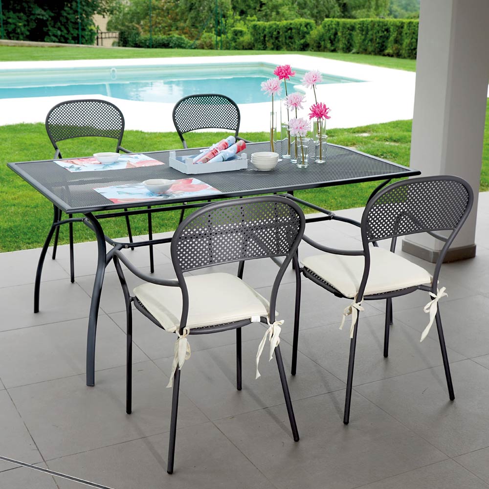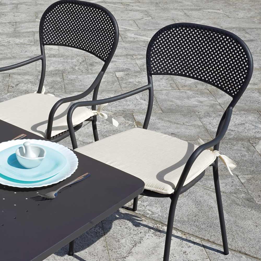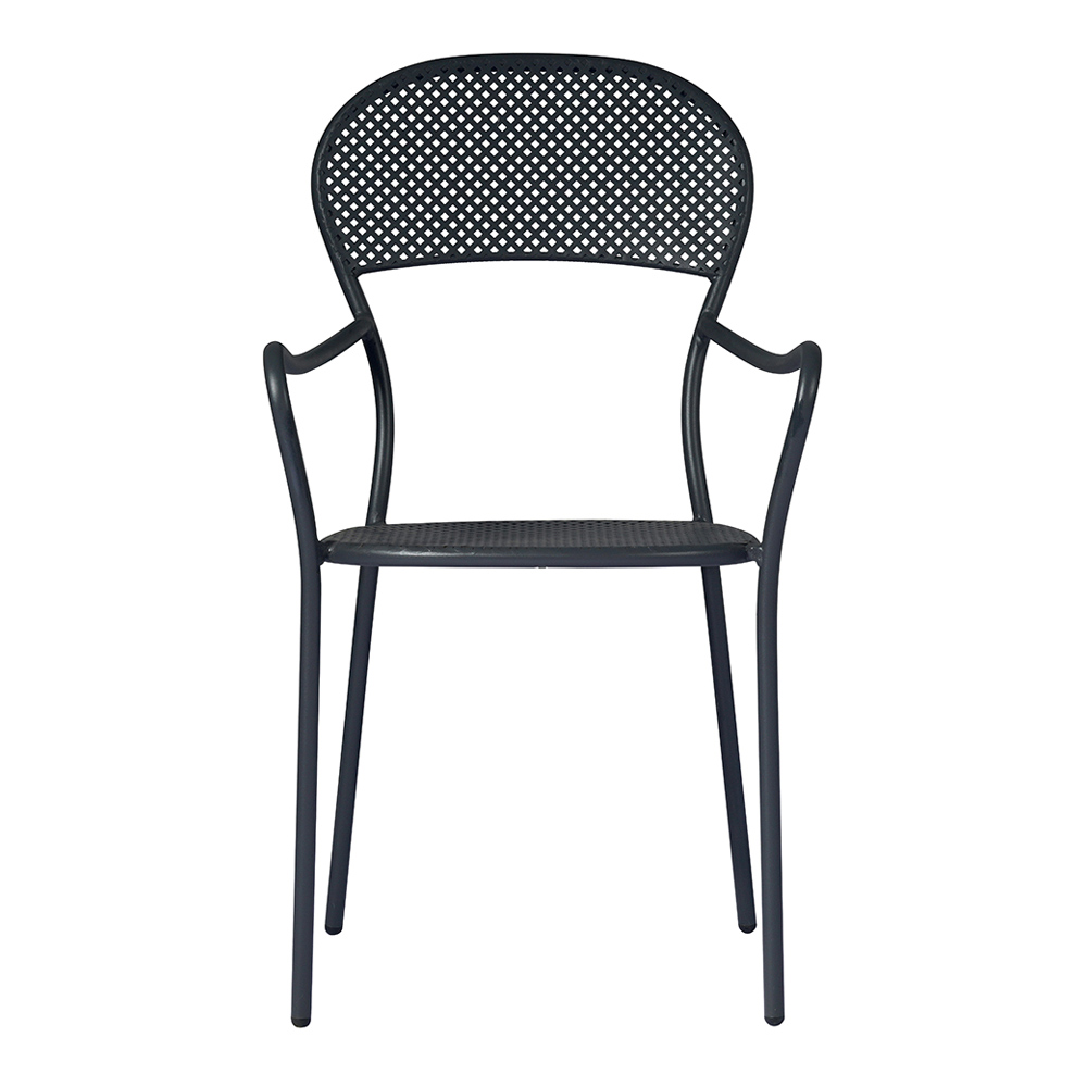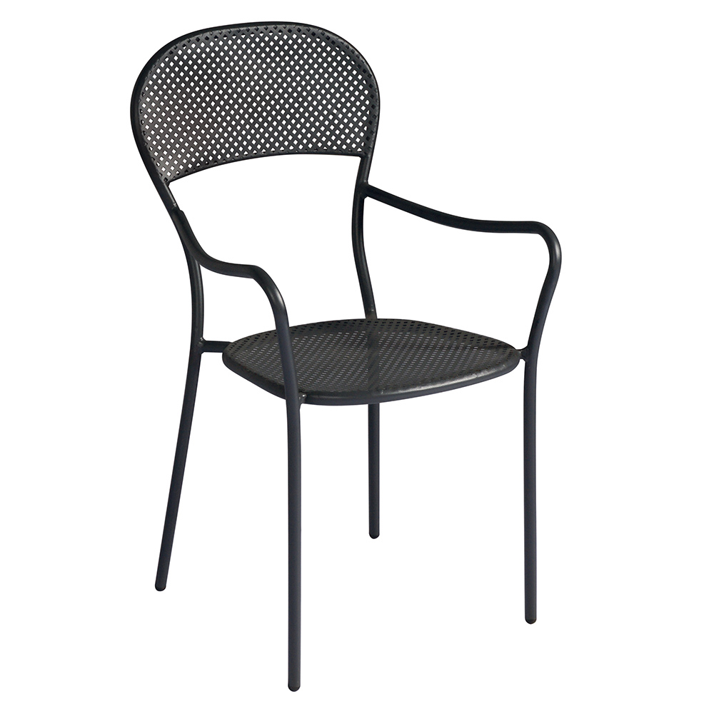 Karrige e jashtme prej hekuri me finiturë gri antracit me strukturë të stivueshme e kompletuar me mbështetëse krahësh praktike . Kjo pjesë moderne e mobiljeve ka një dizajn të pagabueshëm me një ndenjëse të rehatshme dhe të rehatshme . Një ide mobilimi e aftë për t'i dhënë karakter dhe personalitet çdo mjedisi të jashtëm, nga ato shtëpiake si kopshtet dhe tarracat deri te hapësirat e kontraktuara si baret dhe restorantet në natyrë.