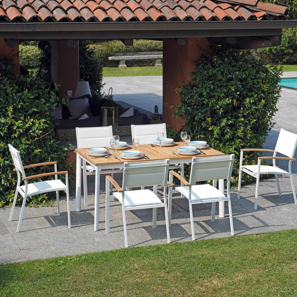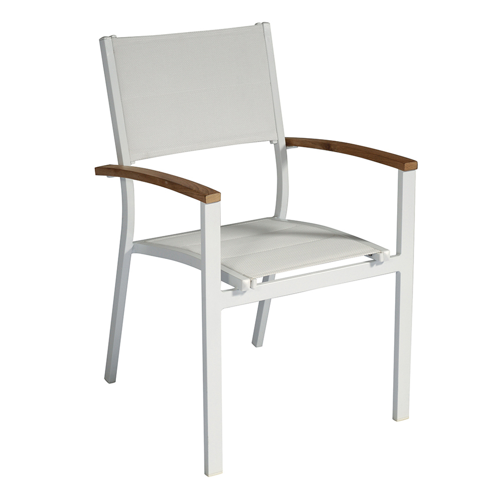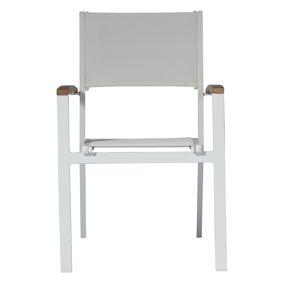 Karrige e jashtme e stivosur me strukturë prej alumini dhe ndenjëse prej tekstili të mbushur me fildishtë pasuruar me mbështetëse elegante prej dru tik. Kjo karrige e jashtme kombinon dizajnin dhe thjeshtësinë , rezultat i materialeve të thjeshta por rezistente që i japin jetë një produkti me një dizajn origjinal dhe avangard, perfekt për të kompletuar çdo ambient.