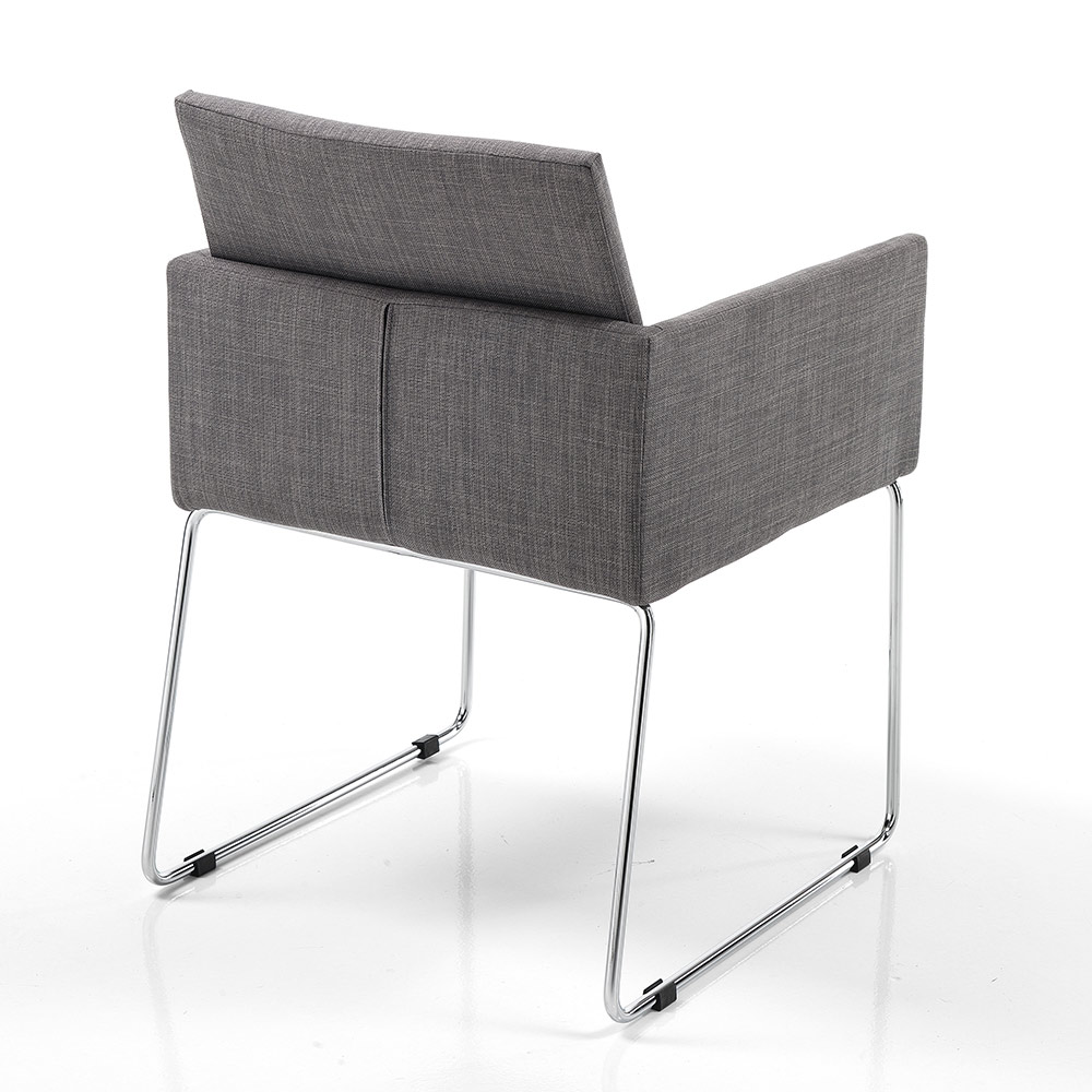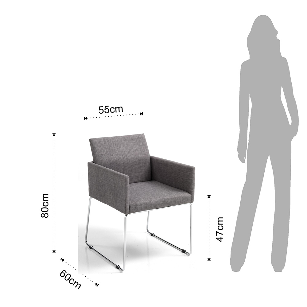Karrige kuzhine me kornizë metalike të kromuar dhe ndenjëse e mbuluar tërësisht me pëlhurë gri e pajisur me mbështetëse krahësh praktike dhe komode . Ideale për t'u vendosur në dhomën e ngrënies dhe kuzhinën, por edhe në një dhomë pune ose zyrë falë dizajnit elegant dhe të rafinuar dhe shkathtësisë së tij të përdorimit. Format që shënojnë figurën ofrojnë një ndenjëse veçanërisht mikpritëse dhe të rehatshme për të siguruar momente të mrekullueshme kushtuar relaksimit.