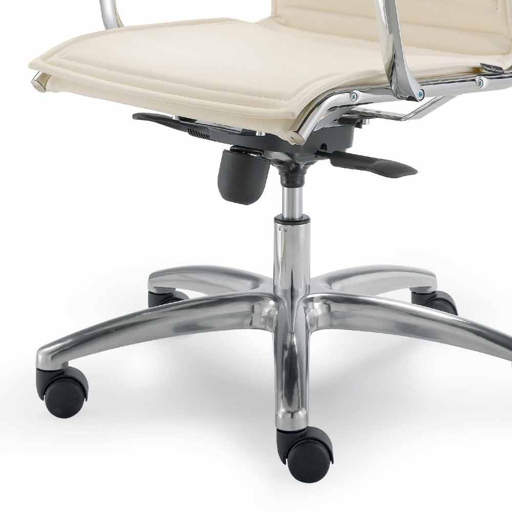 E veçanta e tij është veshja prej lëkure faux e ngjyrosur me krem dhe shpina e lartë e mbushur e cila e bën atë edhe më të rehatshme. Komplet me armatura alumini të kromuar dhe një bazë 5 yje në alumin të lëmuar, të kompletuar me rrota të frenuara prej Ø 50 mm.