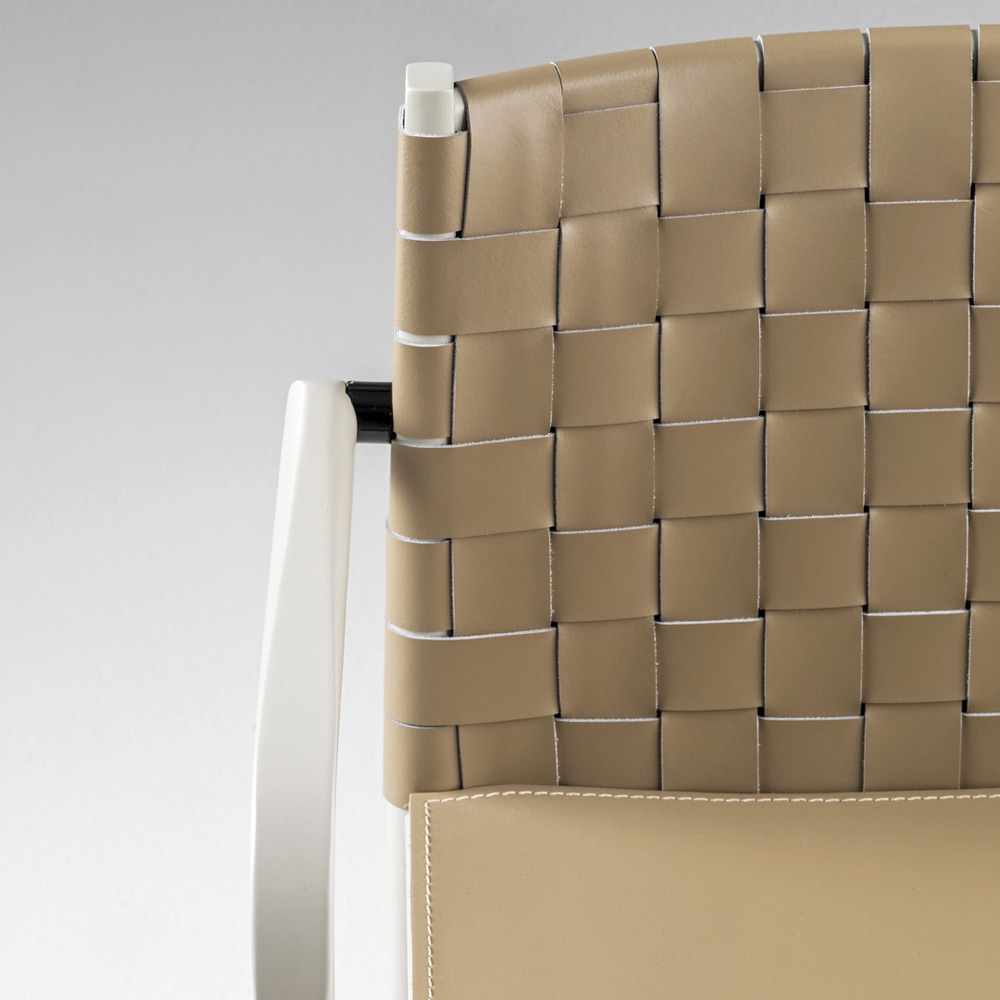 Karrige moderne me mbeshtetese prodhuar ne Itali me strukture druri ahu te llakuar bezhe dhe mbrapa dhe sedilje lekure. Një dizajn që merr shkas nga stilet tradicionale të rishikuara në një çelës bashkëkohor për të krijuar një plotësues që pajton një anë funksionale dhe një anë thjesht dekorative të aftë për të karakterizuar dhe bërë mobiljet e çdo mjedisi modern unik. Ajo që pasuron estetikën është veçantia e pjesës së pasme në lëkurë të endur e cila rrit origjinalitetin e produktit dhe e cila, falë gamës së ngjyrave të disponueshme, i përgjigjet çdo nevoje të stilit, duke arritur të krijojë një harmoni unike midis të gjithë aksesorëve. i pranishëm