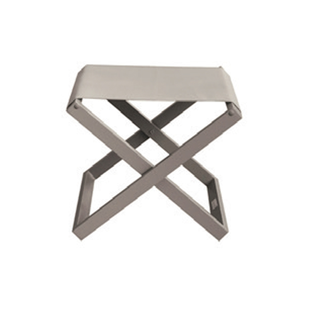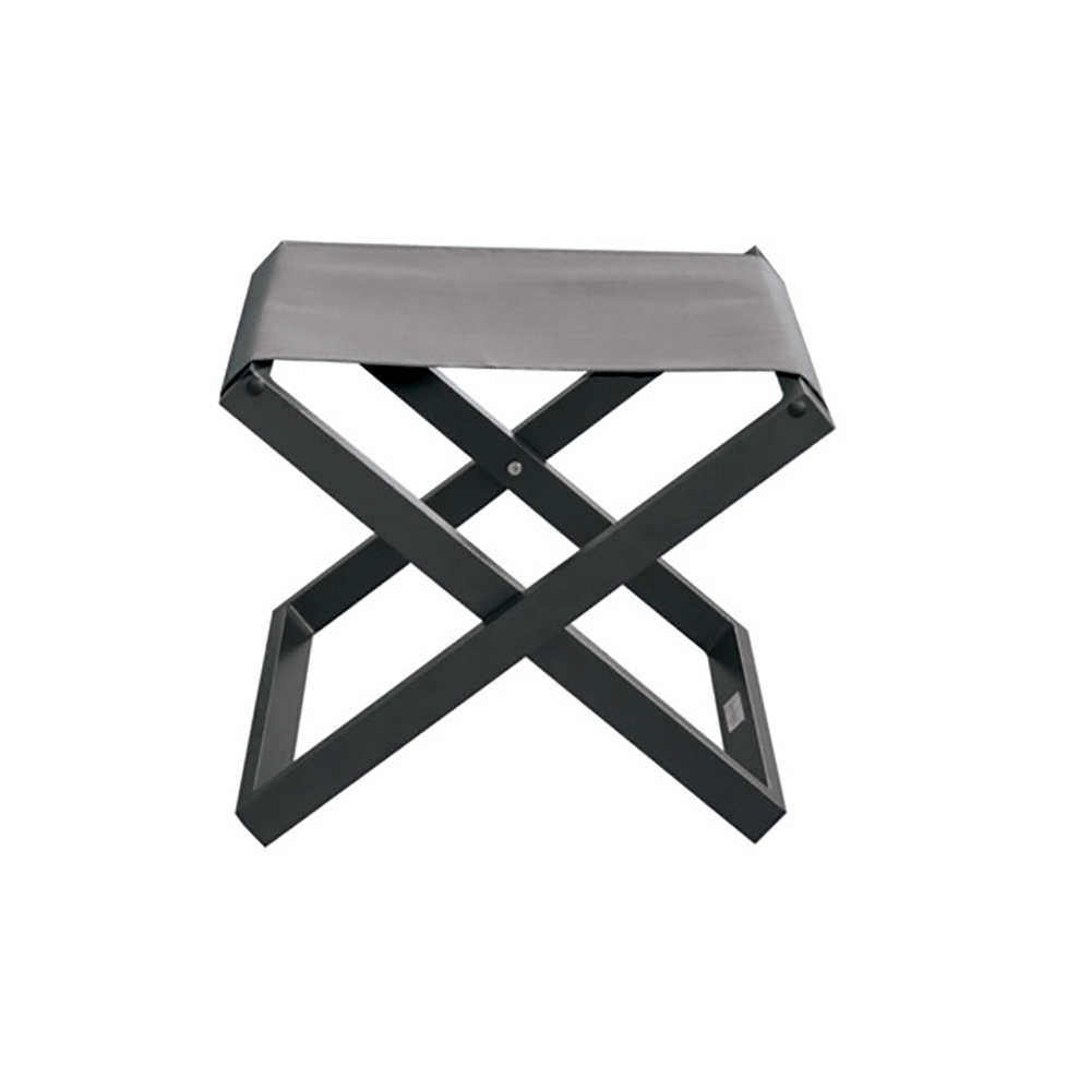 Karrige e ulët për përdorim të jashtëm me strukturë prej alumini dhe tekstili të veshur me pluhur.