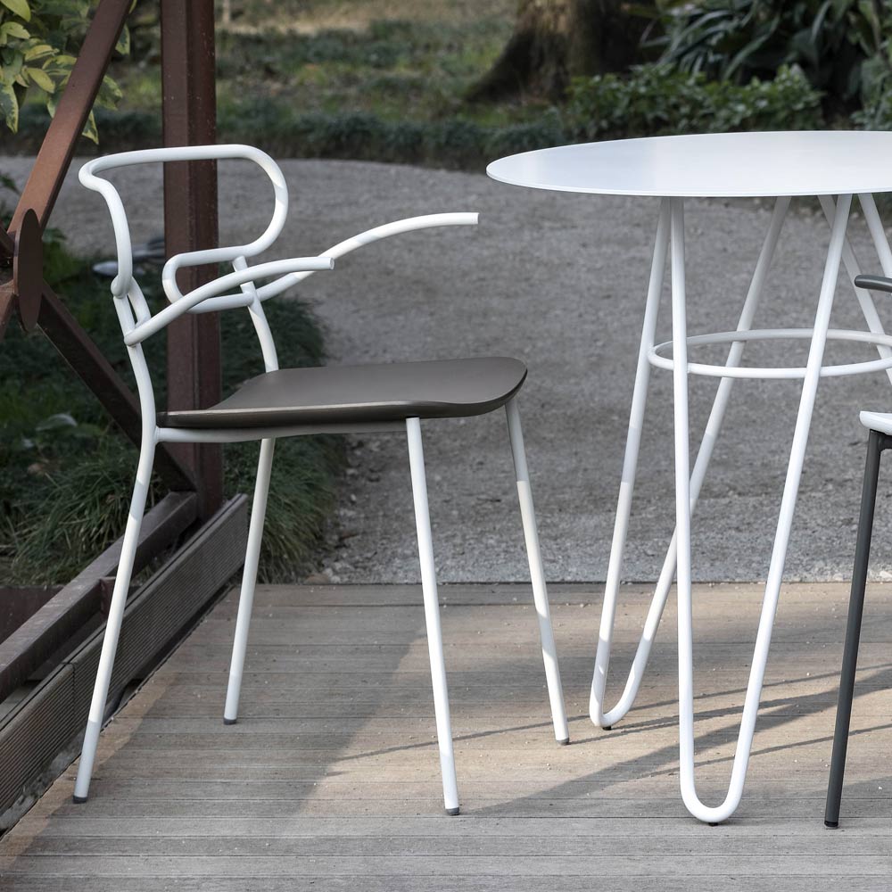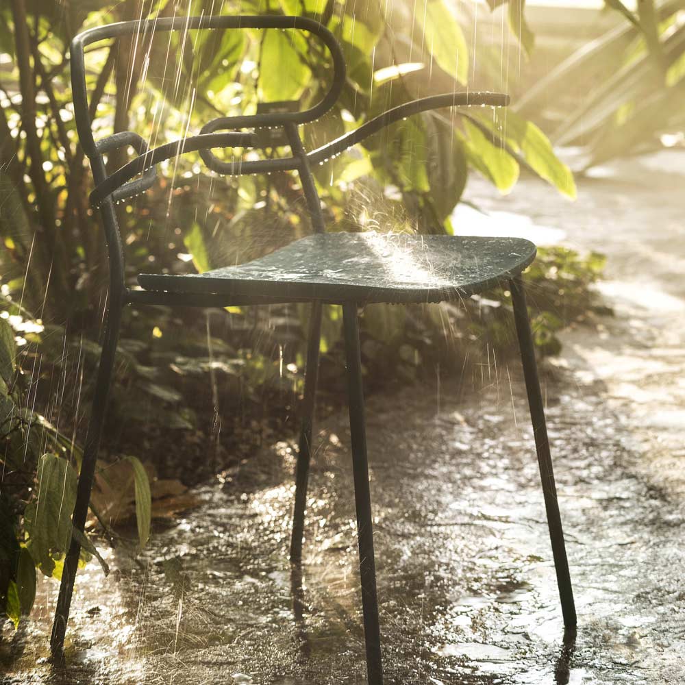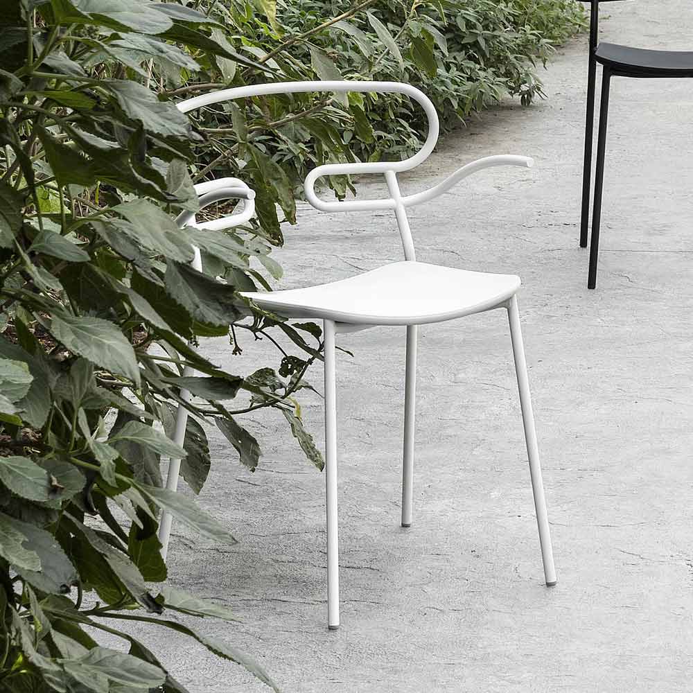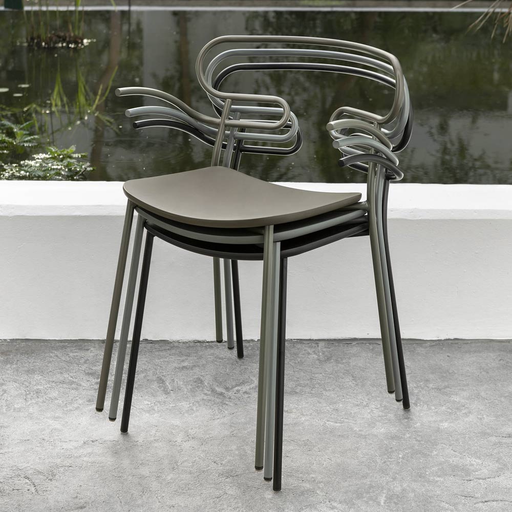 Karrige në natyrë prodhuar në Itali me strukturë metalike të pikturuar dhe sedilje poliuretani. E thjeshtë dhe thelbësore, kjo shtesë plotësohet në sajë të linjave të saj të lehta dhe formës së veçantë të mbështetëses së fituar të mbështetur në lakimin e një tubi të vetëm metalik, duke krijuar kështu një dizajn të pazakontë dhe avangardë. Ideale për zbukurimin e ambienteve tuaja të jashtme me personalitet si kopshte, veranda dhe tarraca, ka një tipar veçanërisht funksional që është mundësia e pirgimit për të marrë një zgjidhje praktike dhe të rregulluar lehtësisht duke optimizuar hapësirat tuaja kur karriget nuk përdoren.
