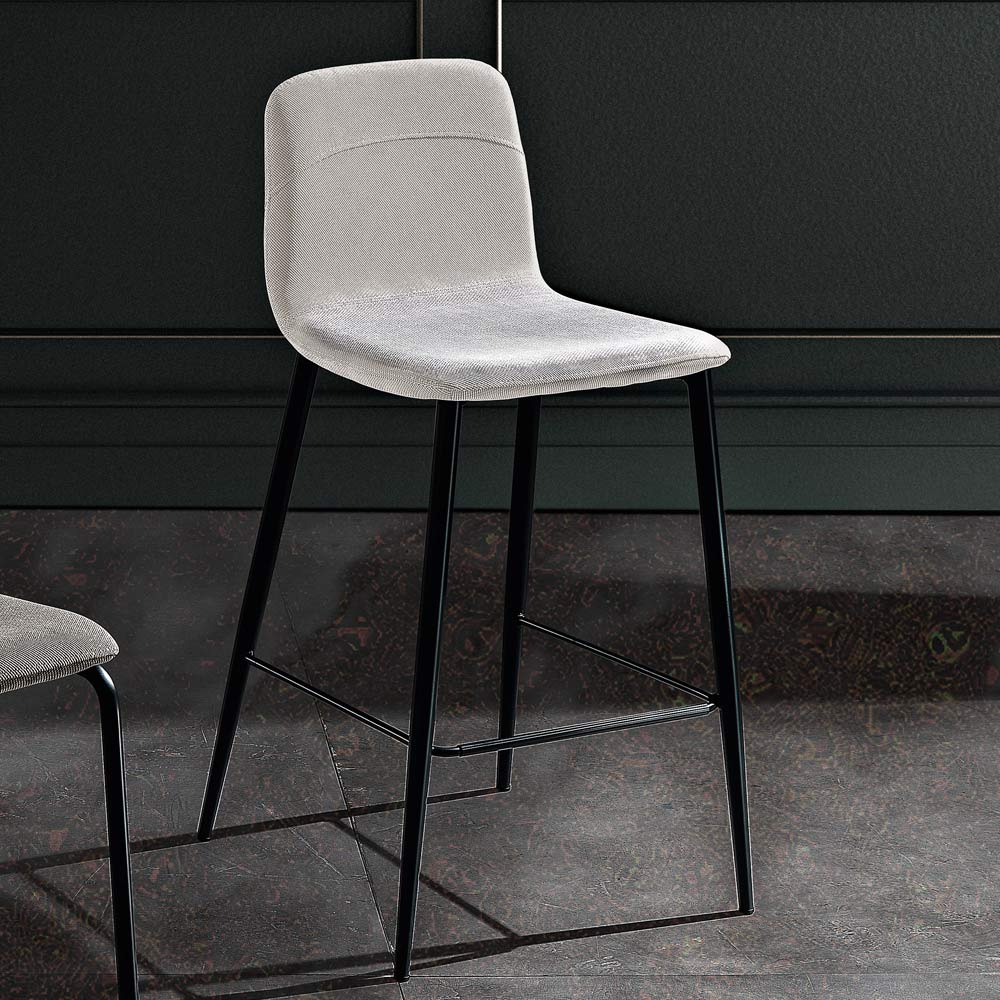 Karrige kuzhine me ndenjëse të mbuluar me pëlhurë dhe kornizë metalike me tub të rrumbullakët (diametri 16 mm) me finiturë mat antracit RAL 7021 e kompletuar me mbështetëse praktike për këmbë, prodhuar në Itali.