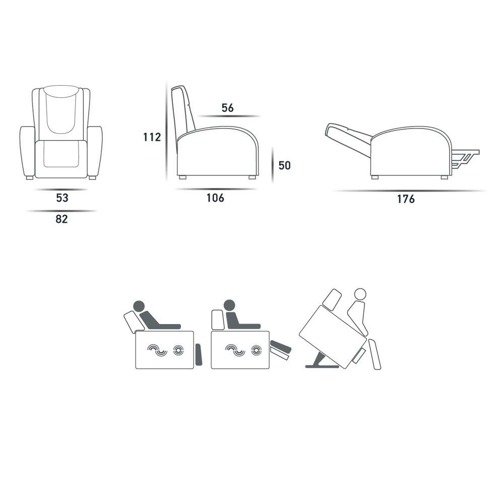 - Vibro: Nëpërmjet veprimit të një pllake vibruese, masazhon gjymtyrët e poshtme, duke stimuluar dekongjestionin e këmbëve dhe duke nxitur qarkullimin e gjakut. Ngritja e mbështetëses së këmbëve dhe mbështetja e plotë e mbështetëses rrit efektet e dobishme të këtij lloji masazhi dhe amplifikon efektet e tij.