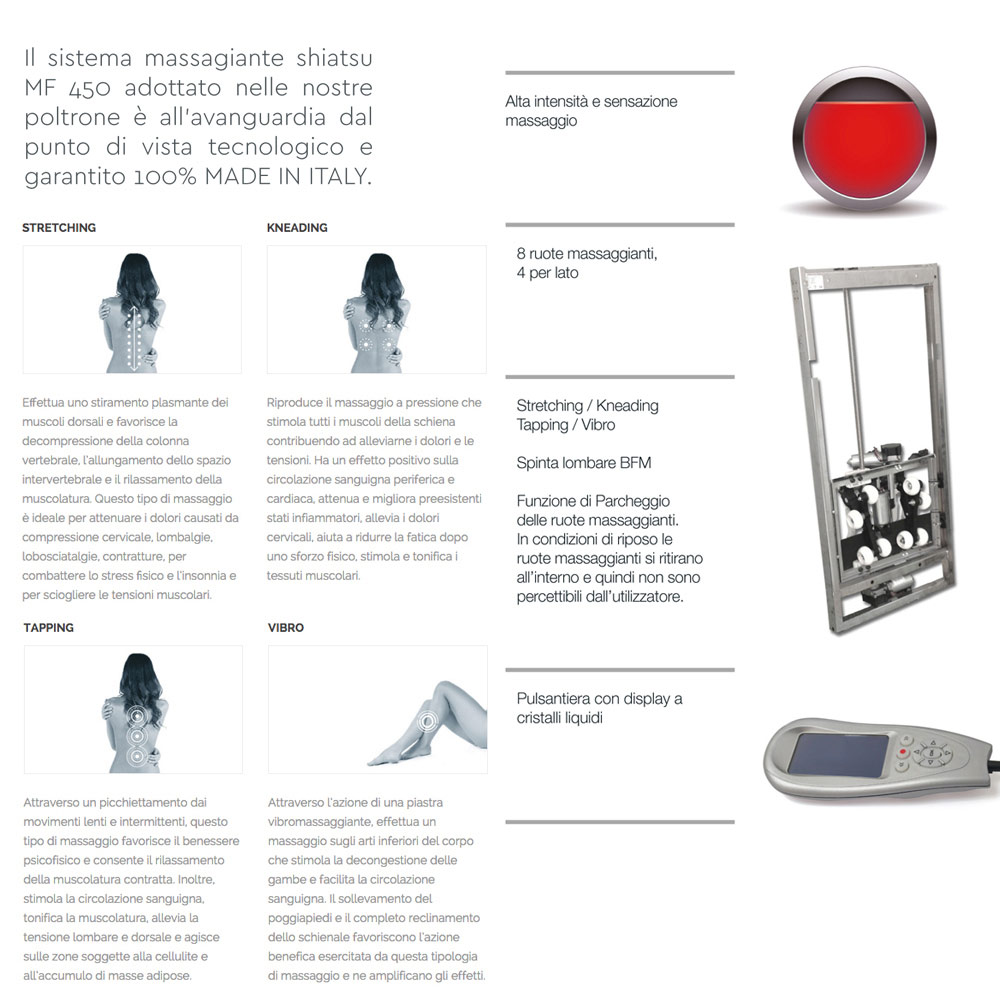 Karrigia e relaksimit Bria përmban gjithashtu masazhin Shiatsu MF450 , një lloj masazhi që përdoret për të përmirësuar qarkullimin e gjakut dhe limfatik, duke gjeneruar qetësi të brendshme dhe mirëqenie fizike. Sistemi i masazhit përmban një mekanizëm me dy krahë të pajisur me rrota masazhi të montuara në shina që rrëshqasin përgjatë kontureve të shpinës, duke siguruar një masazh konstant dhe të njëtrajtshëm në të gjithë sipërfaqen dorsale. Sistemi i masazhit Shiatsu MF450 është teknologjikisht i përparuar dhe i garantuar 100% i prodhuar në Itali .