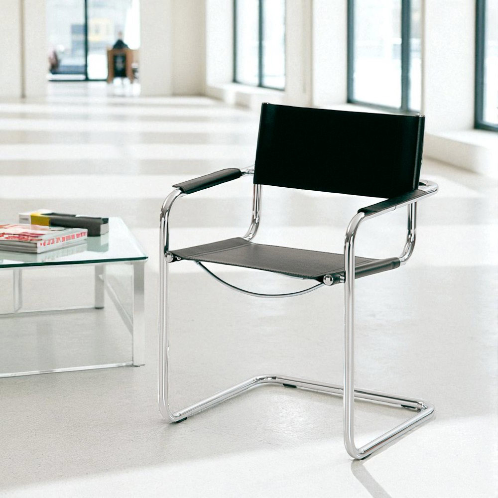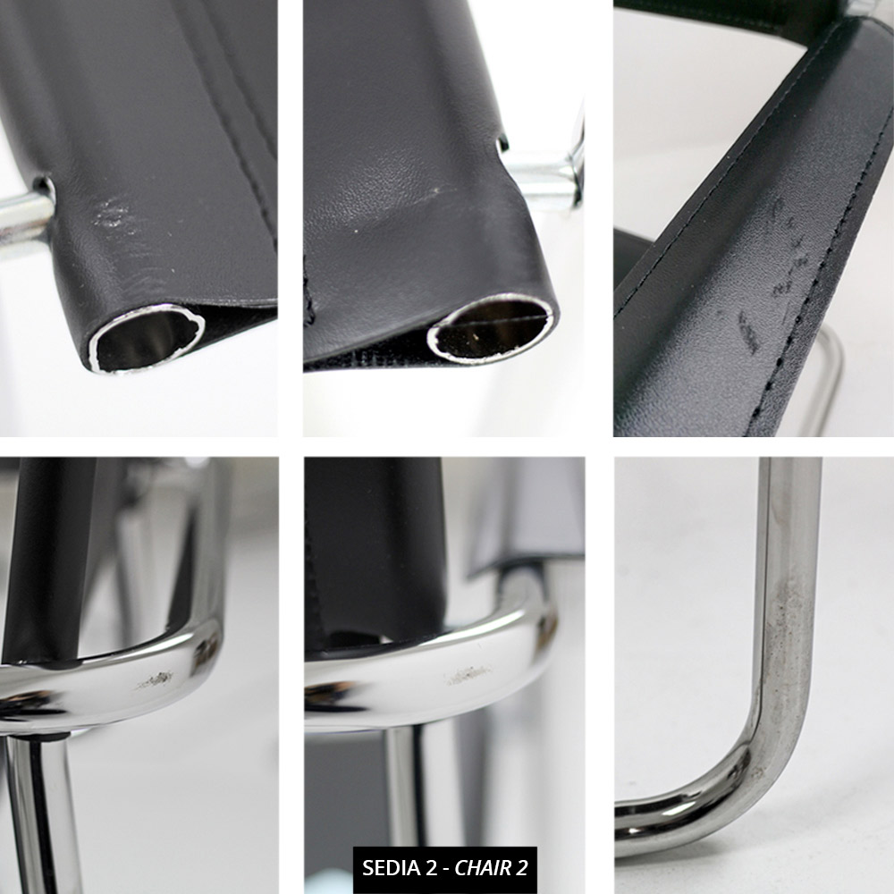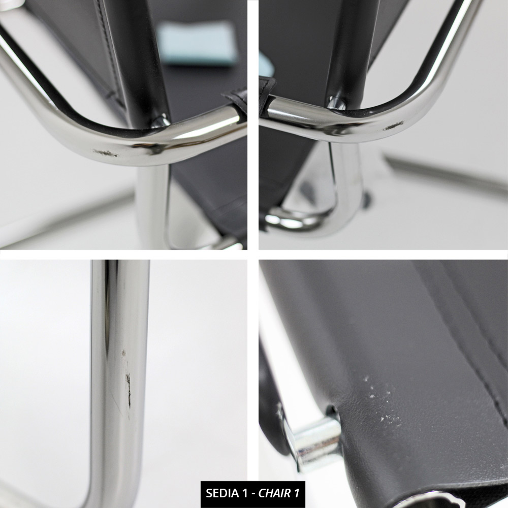 Karrige moderne për sallë mbledhjesh ose konferencash, prej metali të kromuar dhe lëkurë të zezë të lidhur.
