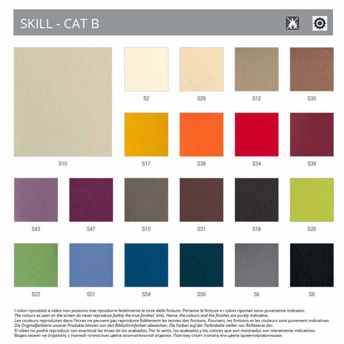 Materiale: Lëkurë e shkathëtuar, CAT. B Pesha: 728 gr / mtl Përbërja: 69% PVC - 20% PL - 10% COT - 1% PU Qëndrueshmëria e fërkimit: UNI EN ISO 105-X12: 4/5 (shkallë gri) Forca e lotit: EN ISO 5470 (Martindale): 50.000 cikle Qëndrueshmëria e dritës: UNI EN ISO 105-B02: 6 (shkallë blu) Forca e tensionit: UNI EN ISO 1421: 500 N-290 N Me shkumë të duhur: UNI 9175 classe 1IM - BS 5852-1 pjesë I - EN1021 / 2 IMO Res. A652 (16) Pjesa 8 -TB 117 sezone.E f.1 (California)